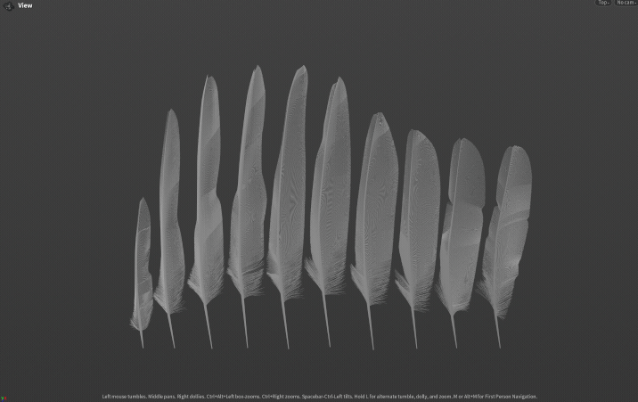 I highly recommend finding good references for this task. I used a mixture of the Feather Atlas and Featherbase . Both of these websites are free and have great atlases of feathers from many different species, sometimes even with scale measurements. The idea is that you can load these into your Houdini scene as a background (Press "D" in the viewport and go to "Background") and then trace on top of them using the top view. You don't need to worry about where in world space you draw your feathers, Houdini automatically figures out where the root of the shaft is when you start grooming.