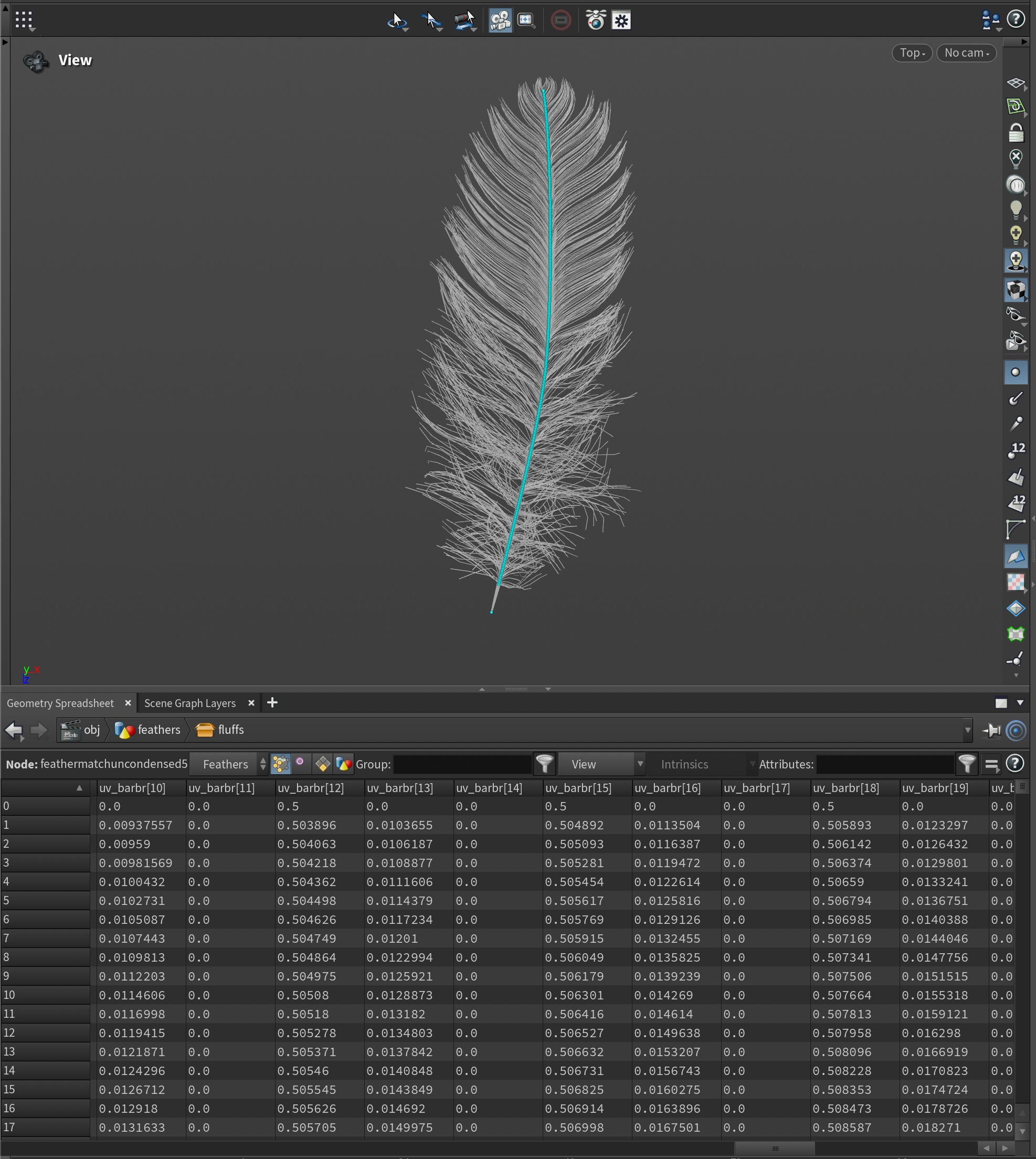 The new feather system in Houdini provides a very resource-efficient approach to storing what would otherwise be very heavy pieces of geometry. You have two representations available for feathers - condensed and uncondensed. Uncondensed is raw geometry where each barb has its own individual geometry, whereas condensed feathers only contain the shaft itself in raw geometry. In a condensed feather, the location of the cvs/points of the individual barbs are instead stored as 1-dimensional arrays of size x on each point of the shaft (P_barbl and P_barbr) where x is equal to the number of points on the barbs multiplied by 3 (so you have a value for x, y, and z position on each barb point). In addition, you also have attributes like barborient , uv_barbl and uv_barbr to represent orientation and UVs on the barbs. The viewport is still able to render the barbs for you, but since it's technically not "raw" geometry it can be rendered in a much more resource-efficient way.