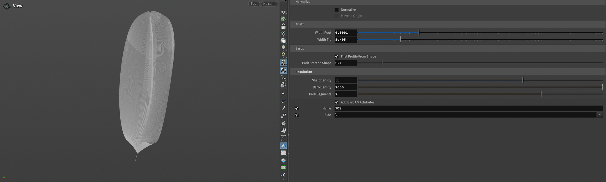 On this node, you'll also be able to set the resolution, width, name, and sides. I recommend setting the Side and Name parameter to something that makes sense (for Side that'll usually be l). This will become very important when we start grooming. For the Barb Segment parameter it's also important to keep an eye out. This parameter should always be the same for all of your feathers as merging feathers with different Barb Segment values can produce unexpected results (I believe this is because this parameter controls the size of all of your P_barbl, P_barbr , etc. attributes, and Houdini doesn't know what to do when merging attributes of different sizes).