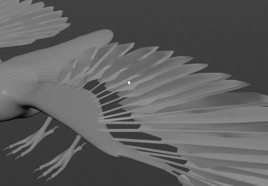 The manual workflow consists of hand-drawing feathers on your base mesh using a Guide Groom node and then interpolating those curves into feathers. This is great for more specific areas like the wing and tails that often require exact placement of feathers.