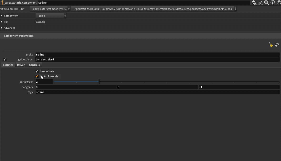 spine Autorig Component.This was also covered in my previous tutorial, but essentially I plugged in all of my spine bind joints into the Driven tab, set up my required controls on the Controls tab and set the controlhiearchy parameter to tangent or fk (depending on the behavior I wanted). For the spine I used tangent and for the neck and tail, I used fk .
