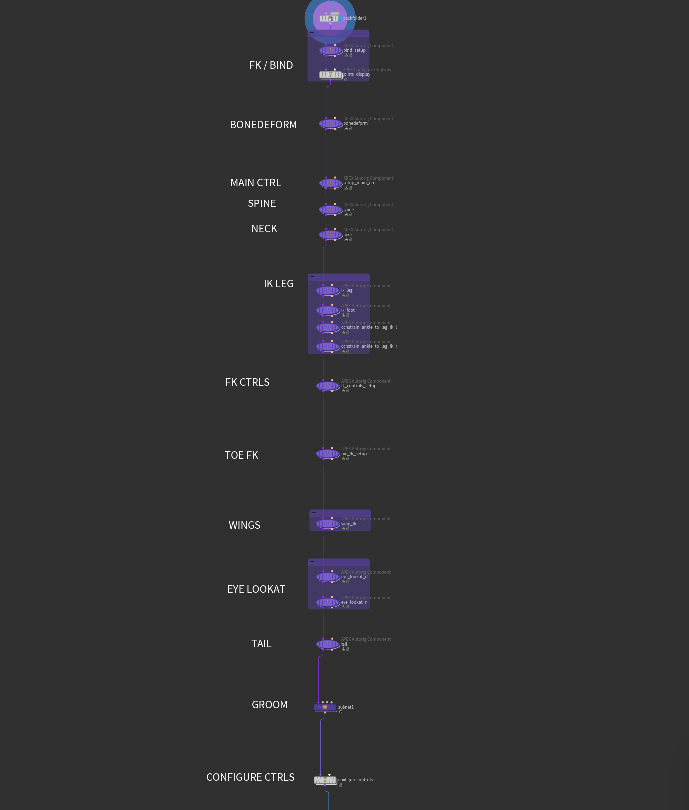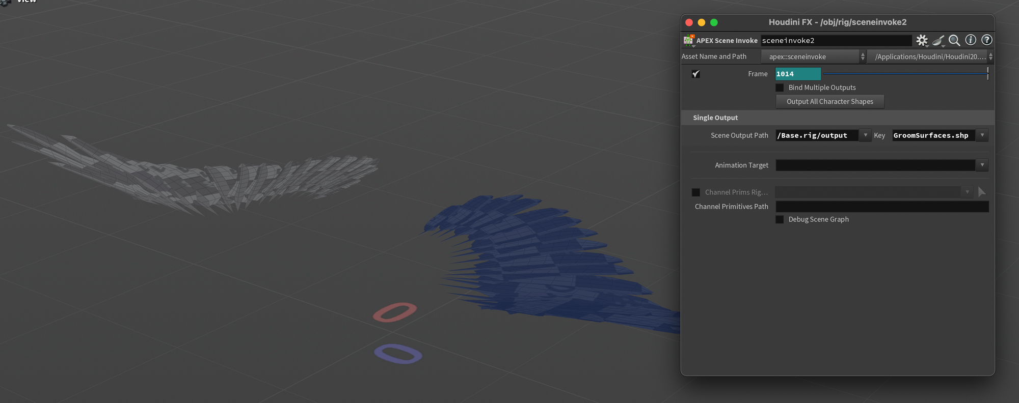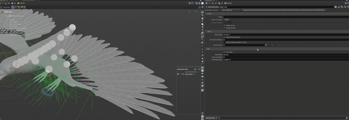 APEX Add Groom.With all of that done you can save your rig using a File Cache and add an APEX Scene Add Character followed by an APEX Scene Animate to start animating your bird. When you're done you can use an APEX Scene Invoke to extract your animated mesh and add simulation or just export.