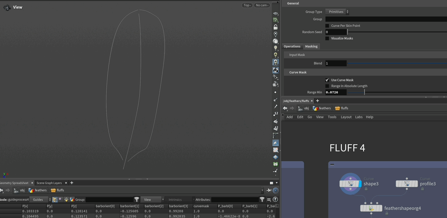 When you plug these into your Feather Shape Organize SOP it will automatically create groups necessary for Houdini to use them as schematics for generating feathers. You can be quite loose in drawing these curves, all of the details will come in the following sections. I recommend using some reference of real feathers to trace on top of for better results (more on that later).
