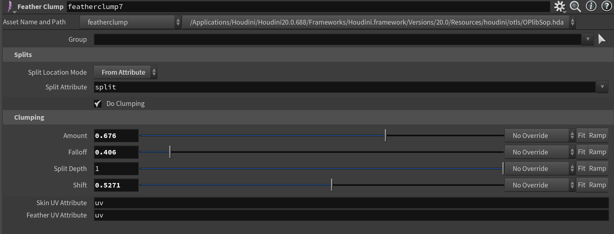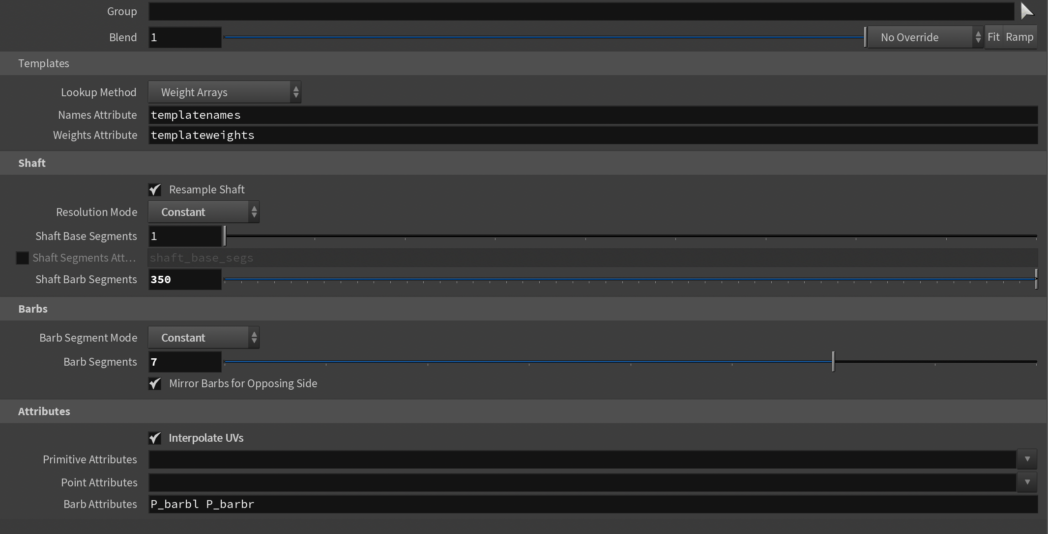 Feather Template Interpolate .This node has a lot of settings, enabling you to resample the barbs and shaft of your feathers, which is quite useful for optimization. There's also an Interpolate UVs toggle which I recommend turning on.
