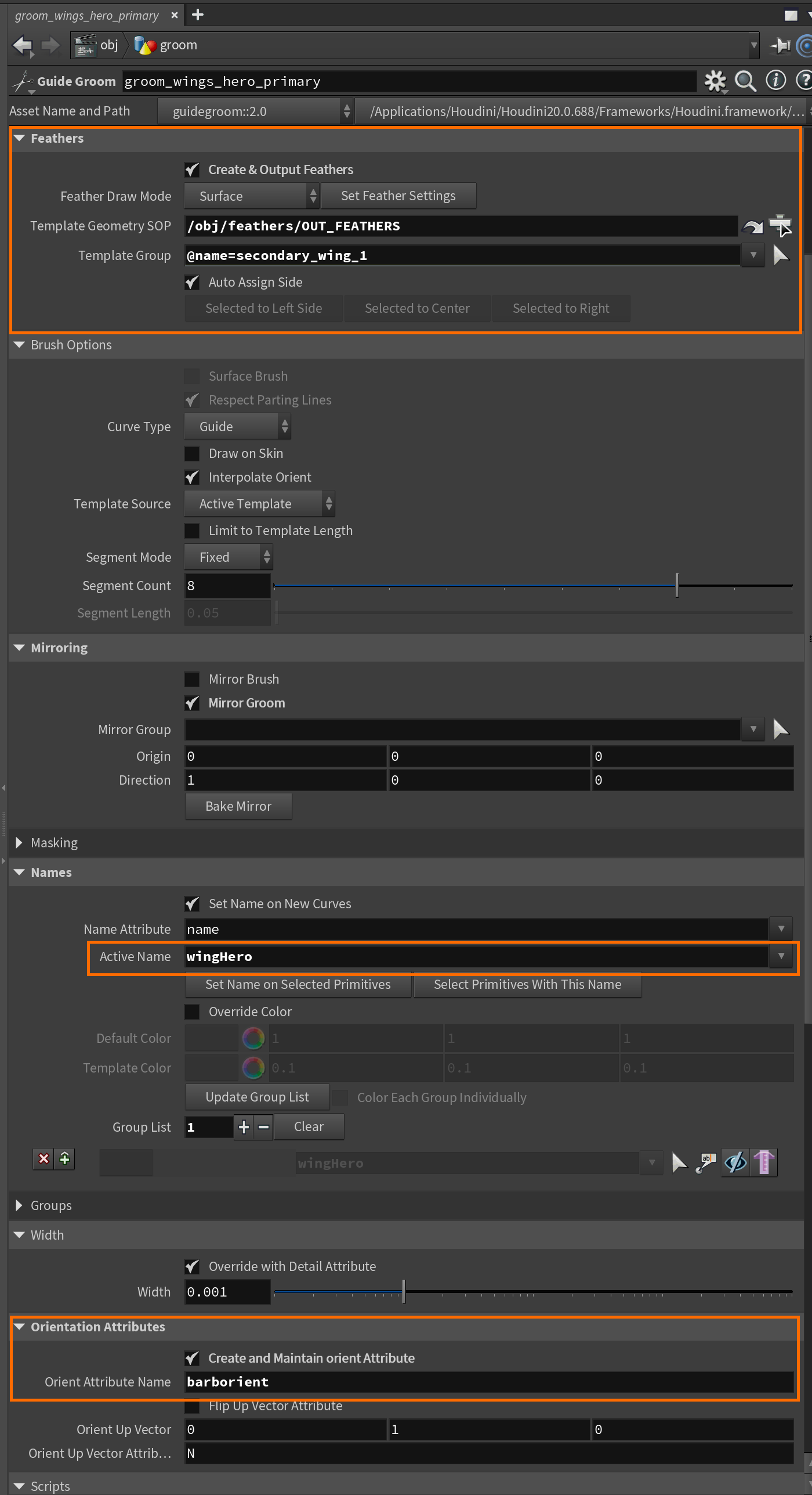 Next, you'll need to also turn on Create and Maintain orient Attribute in the Orientation Attributes section and set the Orient Attribute Name parameter to barborient. This is important as it is what decides the orientation of the barbs and needs to be maintained throughout your groom. You can also set an Active Name for easier grouping of grooms later, as well as turning on Mirror Groom to work on both sides of your character at once - but all of this is optional.
