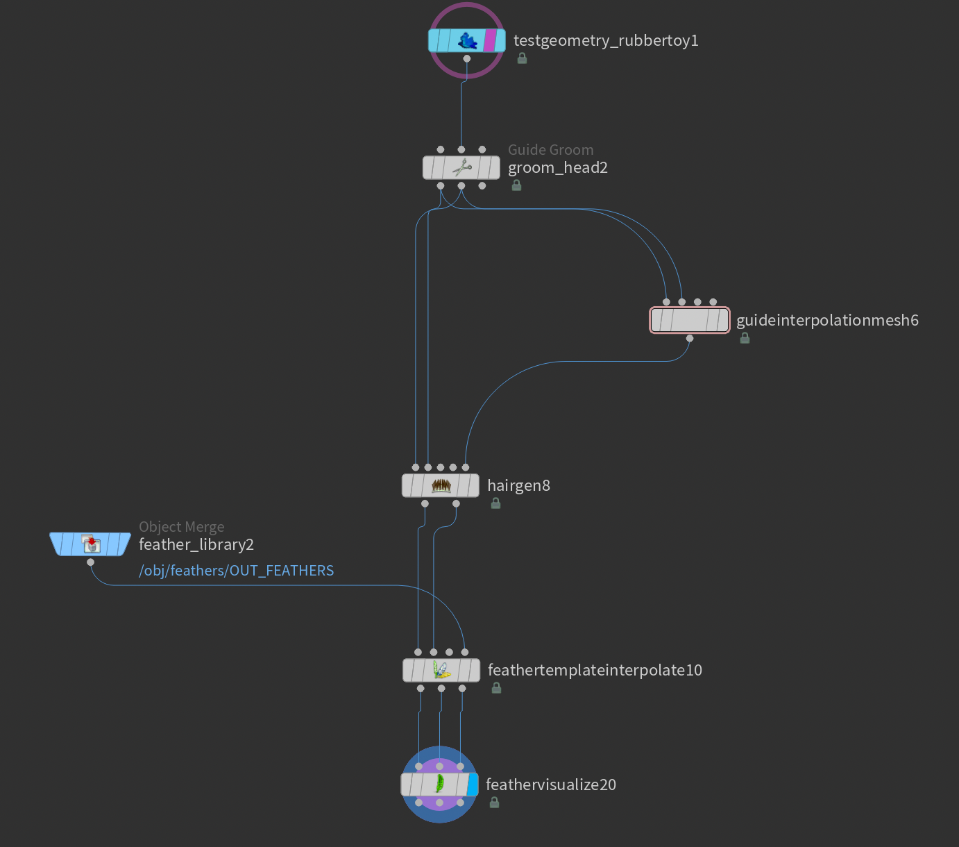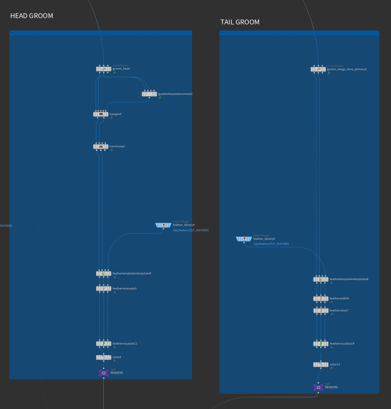In my setup, I split the groom into separate parts that I exported individually (wings, body, tail, etc.). I mainly did this because I found merging feathers a little tricky. It's possible to do (usually seems to behave best when you merge your guides before doing Feather Template Interpolate ) but it was very easy to get strange artifacts and broken feathers. Therefore I exported each area/groom separately and assembled everything in Solaris for rendering. If you want to preview them combined in SOPs you can use a Merge Packed. This approach simply behaved more consistently for me. If someone has experience resolving this in a better way I would love to know!