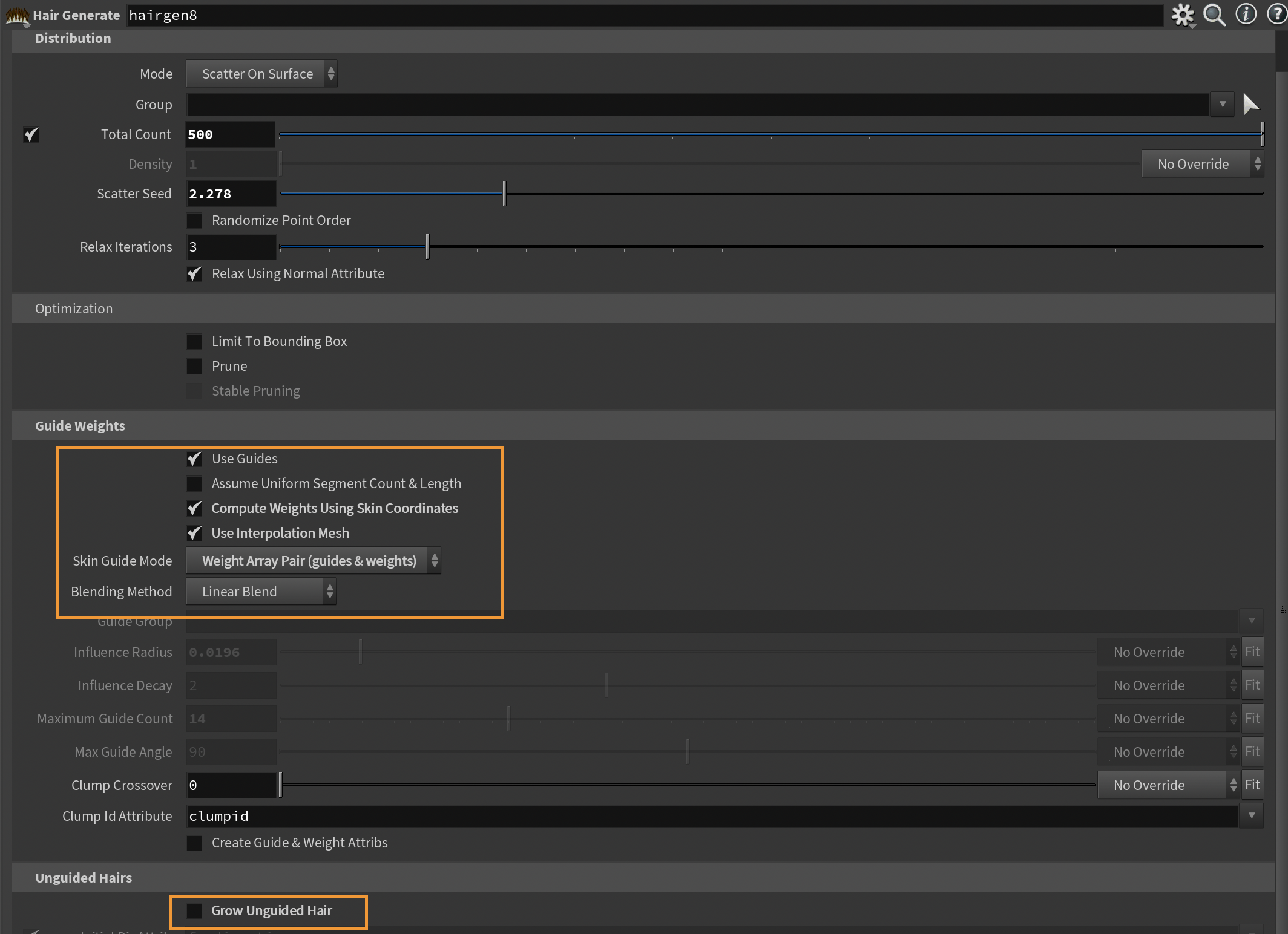 For the Hair Generate you need to plug the skin output from the Guide Groom into the first input, and the guides output into the second input (which is strangely opposite the order of outputs of the Guide Groom ). On the very last input, you plug in the output of the Guide Interpolation Mesh. You then need to set a few parameters in the Hair Generate under Guide Weights - turning on Compute Weights Using Skin Coordinates , Use Interpolation Mesh , and setting Skin Guide Method to Weight Array Pair (guides and weights) .