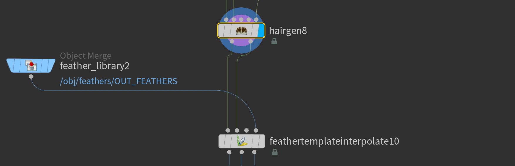 With the output from our Hair Generate node we still need to turn them from curves into proper feathers. You do this by plugging in a Feather Template Interpolate. Essentially this node interpolates your input curves and turns them into feathers based on the attributes stored on the curves and your feather atlas.