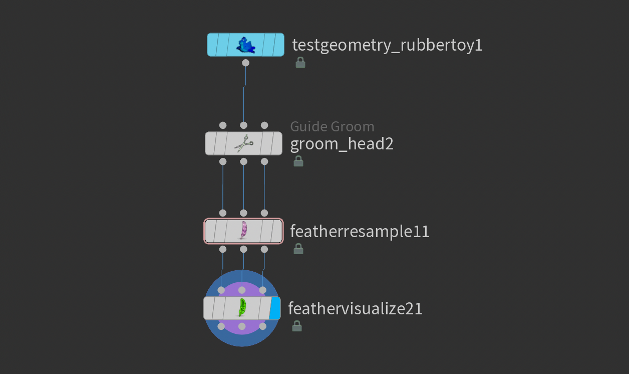 By default, the feathers are usually not very interesting visually so you'll have to add various details like noise and clumping. There are a variety of approaches to this (especially if you're working uncondensed) but for most use cases you'll be using a combination of the specific feather nodes like Feather Noise and Feather Clump . However, you can also use normal Guide Process nodes that you may have encountered if you've ever done grooming in Houdini.