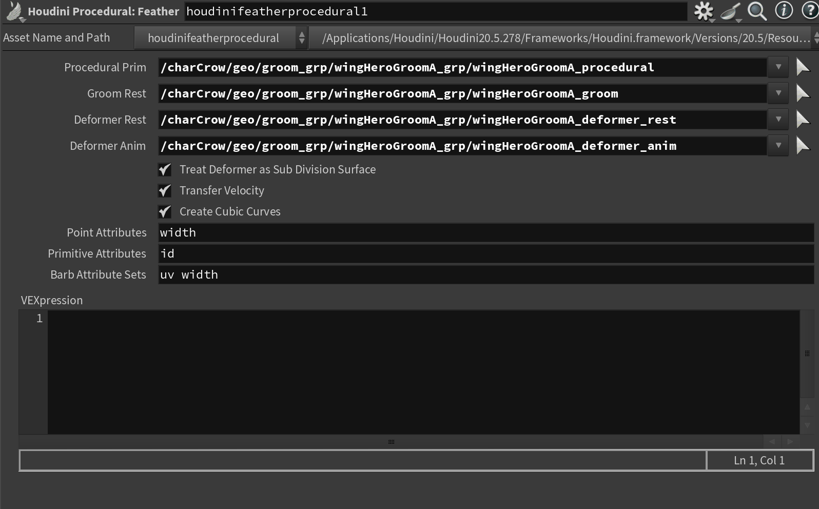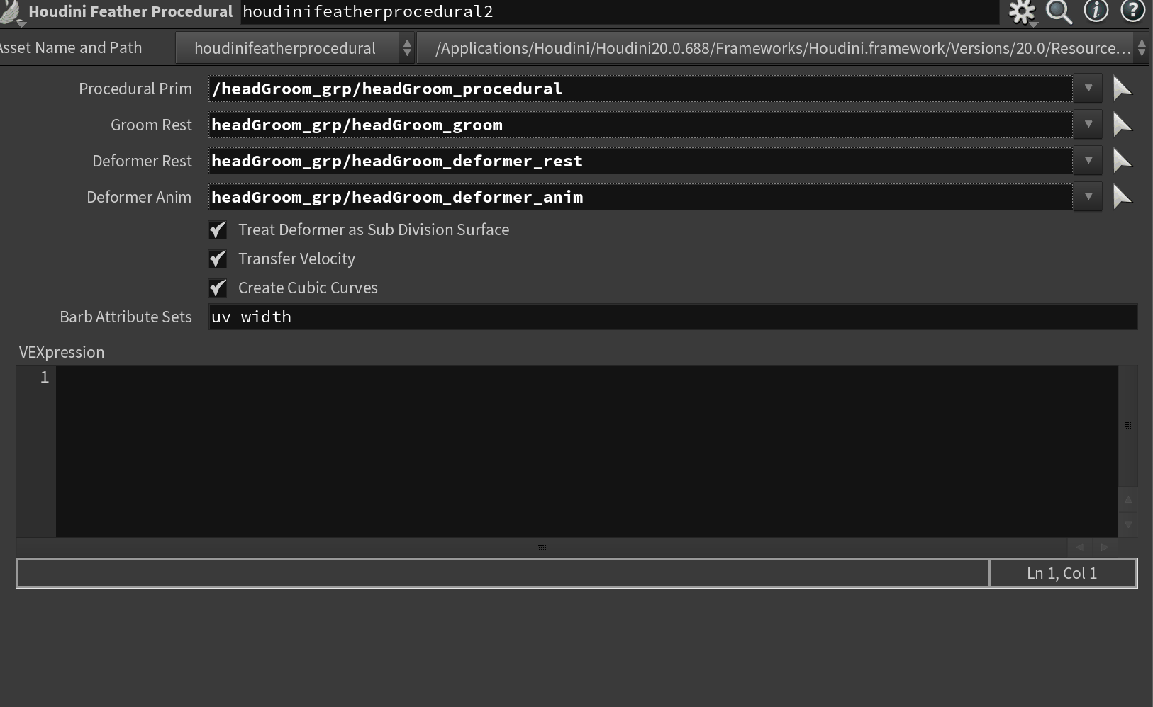 APEX Add Groomid attribute. This must match on your proxy and groom curves - otherwise, you'll get strange results or the node will cast an error.When you've plugged all of this into the node it should usually work out of the box - if you press enter in the viewport with the APEX Add Groom selected you should be able to see your feathers, and if you move your rig it should follow (this is where the tangentu attribute we defined earlier comes in).