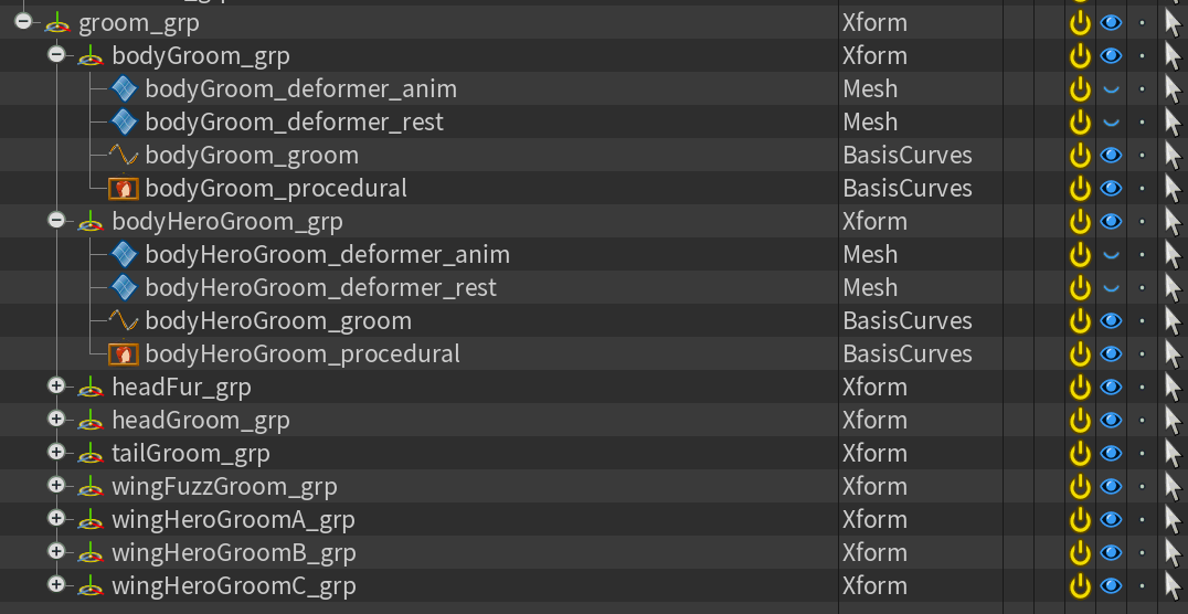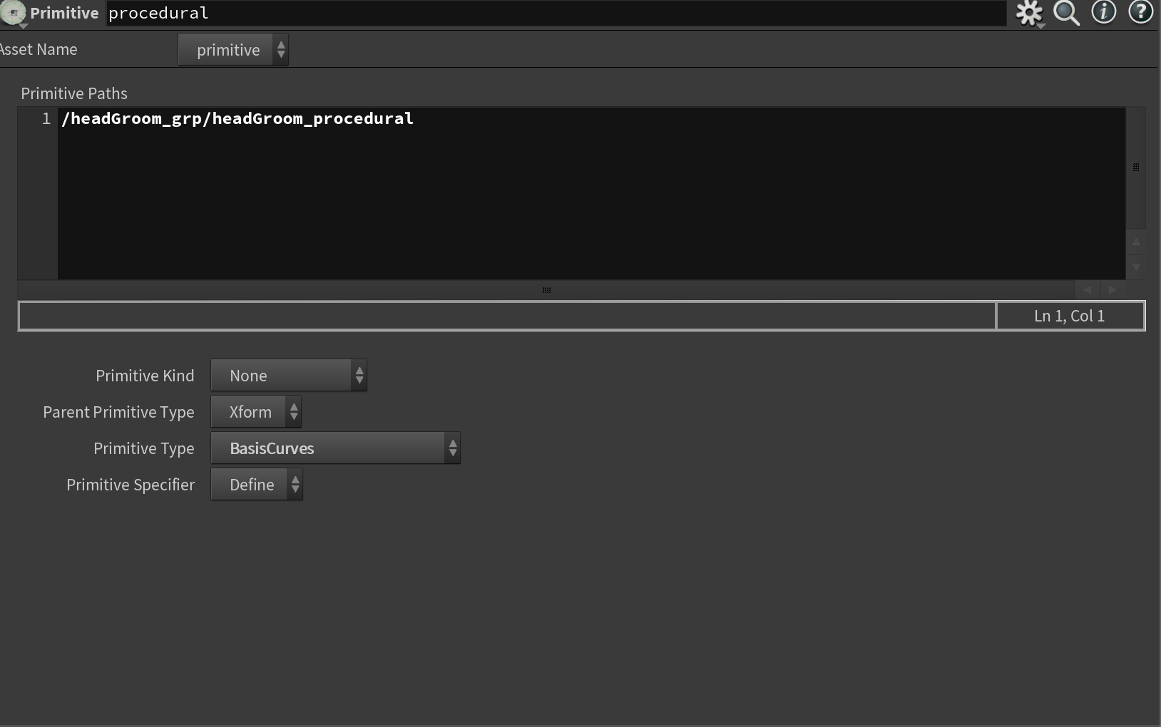 Primitive LOP defining an empty BasisCurves primitive.Groom Rest - This is the parameter that loads the output curves of your groom. You have to first load your groom into Solaris using a SOP Import before the Feather Procedural and set the path to point to that prim.