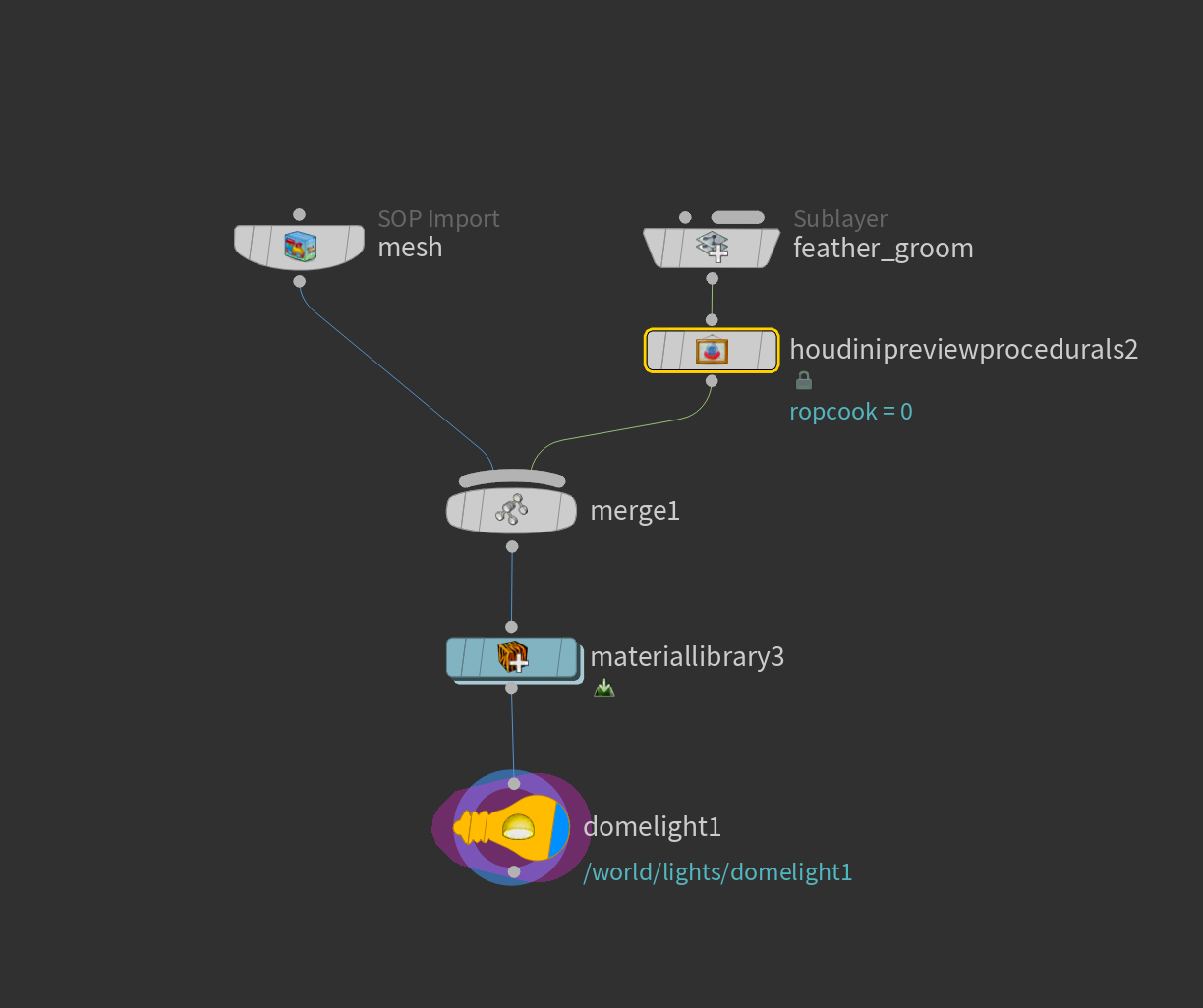 If you setup the Feather Procedural like above and plug in a Preview Houdini Procedurals node you'll be able to render your feathers in Solaris. Below is an example network to give you a better overview. You'll need to do this for each groom export you have.
