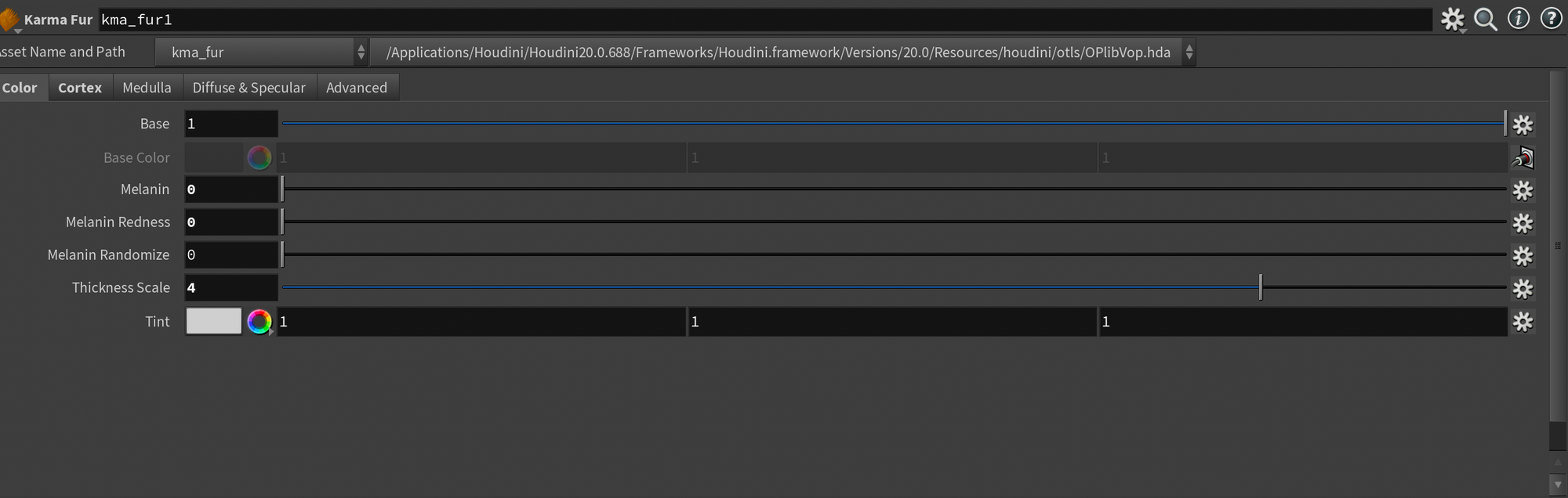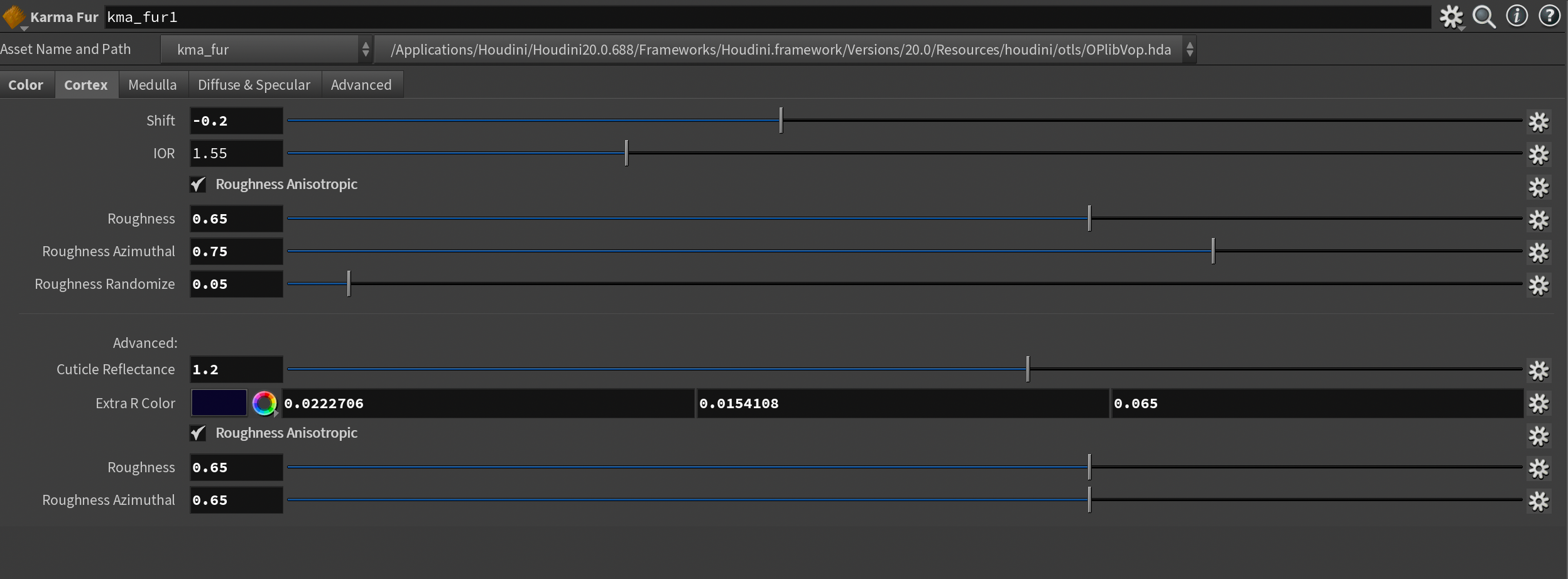 The main parameters here are Shift , IOR, Roughness , and to some extent the Cuticle Reflectance (this one is unique to Karma Fur). You can enable Roughness Anisotropic in two sections, which allows you to control if the light blurs as it travels through the hair, or travels more directly (tweaked through the Roughness Azimuthal parameter). This is optional of course, but I found it nice to tweak a tiny bit.