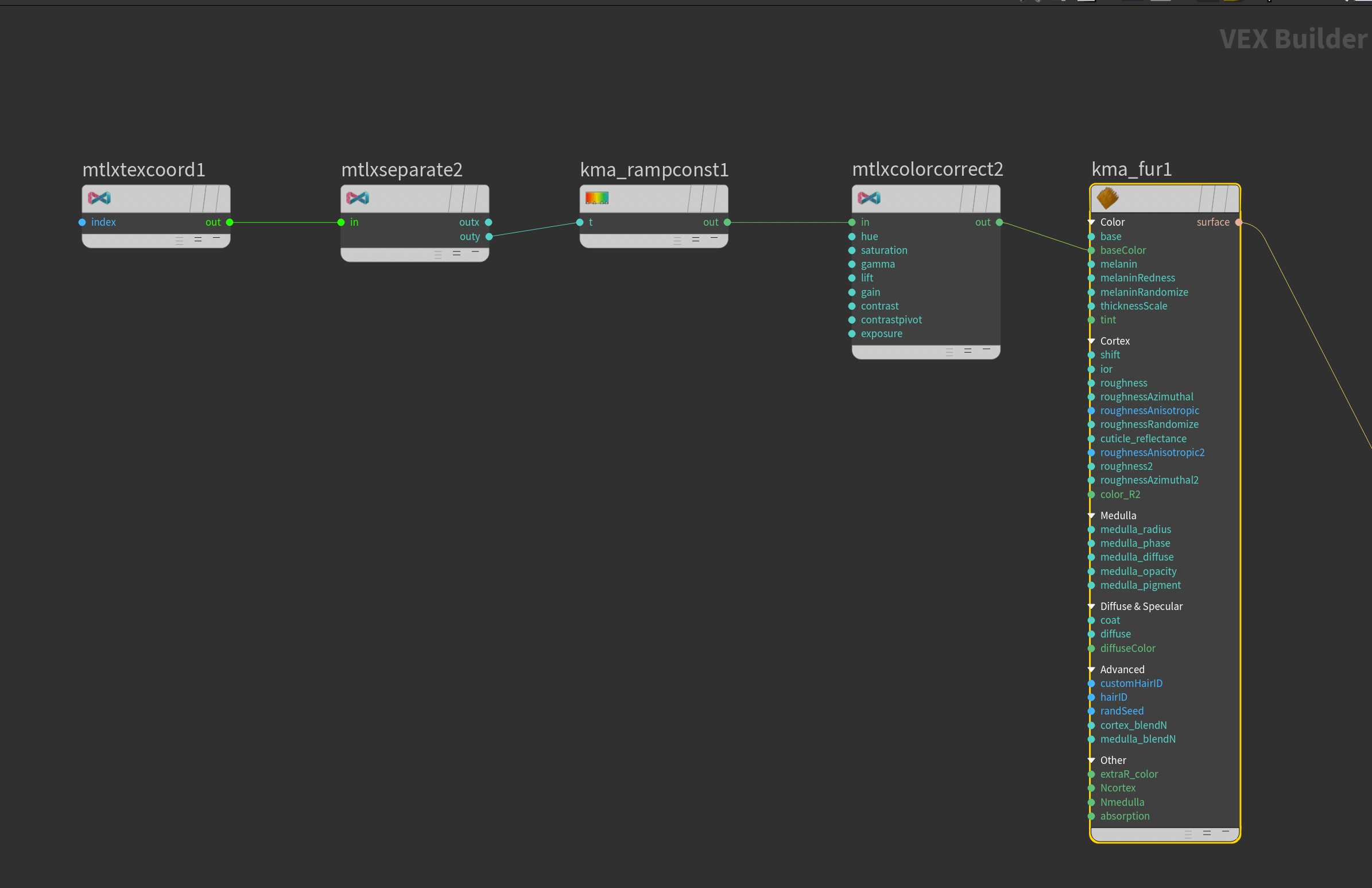 Base Color is simply the color of the hair (or dye if you're using higher values of Melanin ). In my case, I used the UVs on the feathers to create a subtle ramp along the shaft to slightly vary the colors of the feathers. Below you can see what the UVs look like by default. In my case, I extracted the V component from a MtlX Texture Coordinates (seen as green in the visualization below) using a MtlX Separate Vector 2 and plugging it into a Karma Ramp Const .