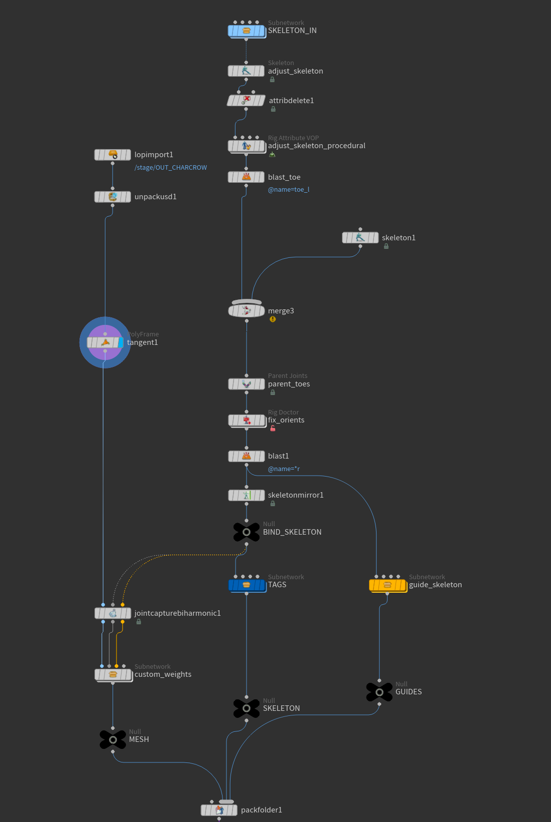 Polyframe/tagent SOP.As always, we have to pack our skeleton, skinned mesh, and guide skeleton into a Pack Folder before we can start rigging. To save time I won't cover this section in-depth, but you can read all about it in my previous APEX tutorial here: