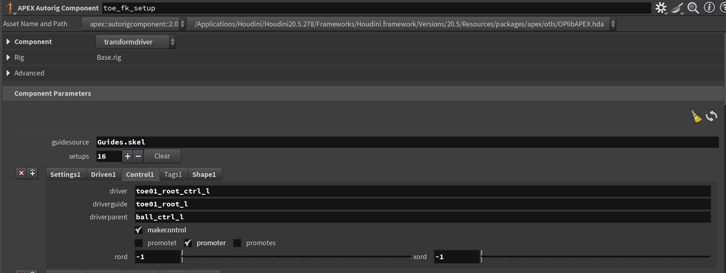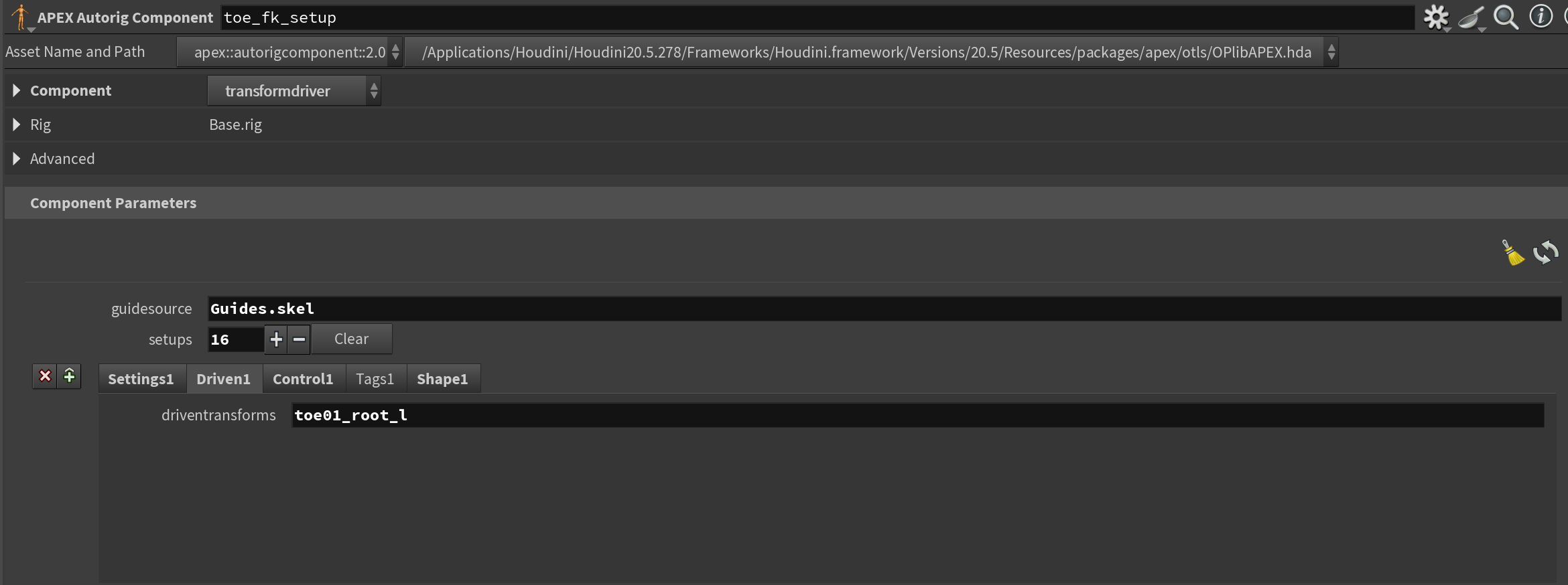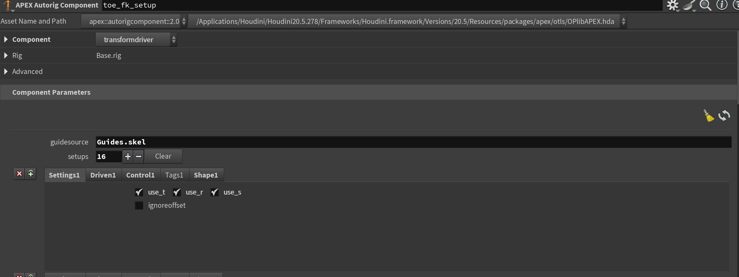 I've batched all the above sections together because they use the same Autorig Component and are fairly straightforward. Using the transformdriver Autorig Component I define custom FK controls for various parts of my rig. This node will generate a new control based on an input Guide skeleton (or generate a new control based on an existing bone in your bind skeleton). For each "setup" in this node (you can add multiple transformdrivers in one node) you have 5 tabs: