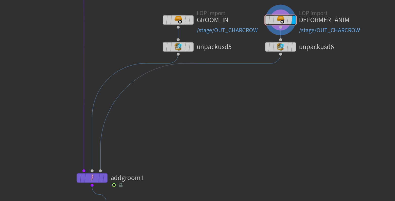 You'll need to load two parts of the groom for this to work - the groom curves and the proxy geometry surfaces. If you used my HDA to export your groom you can simply do a LOP import and grab the primitive labeled groom for the curves, and the deformer_anim for the proxy meshes. Then drop down an Unpack USD to Polygons and you're good to go! Of course, you can also load your groom directly from SOPs if you wish - I'm just trying to present an idea of how you might handle this in a USD production pipeline.