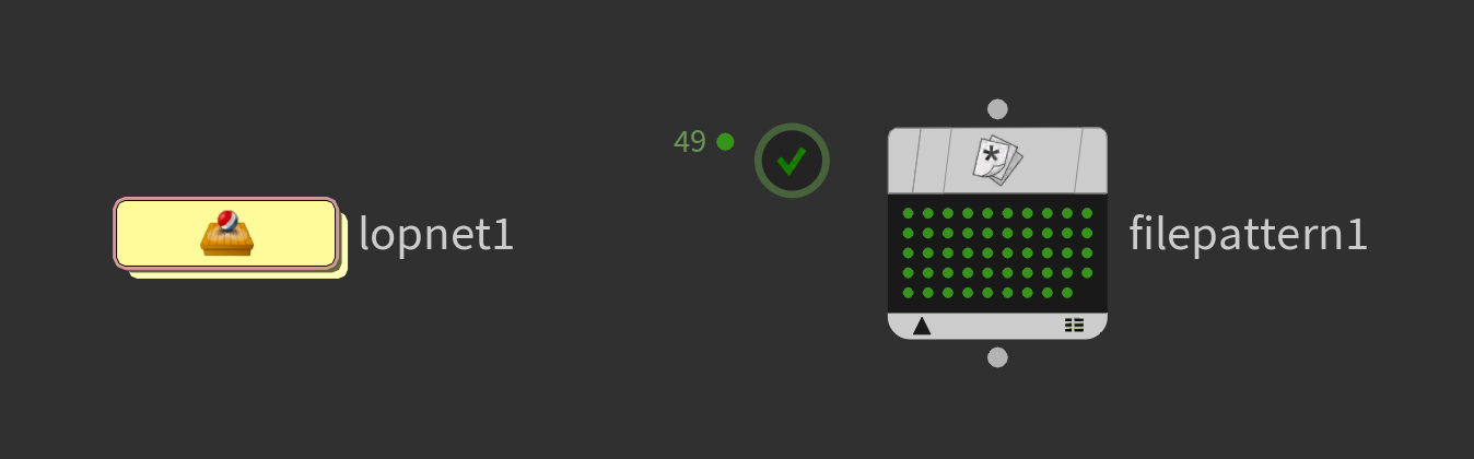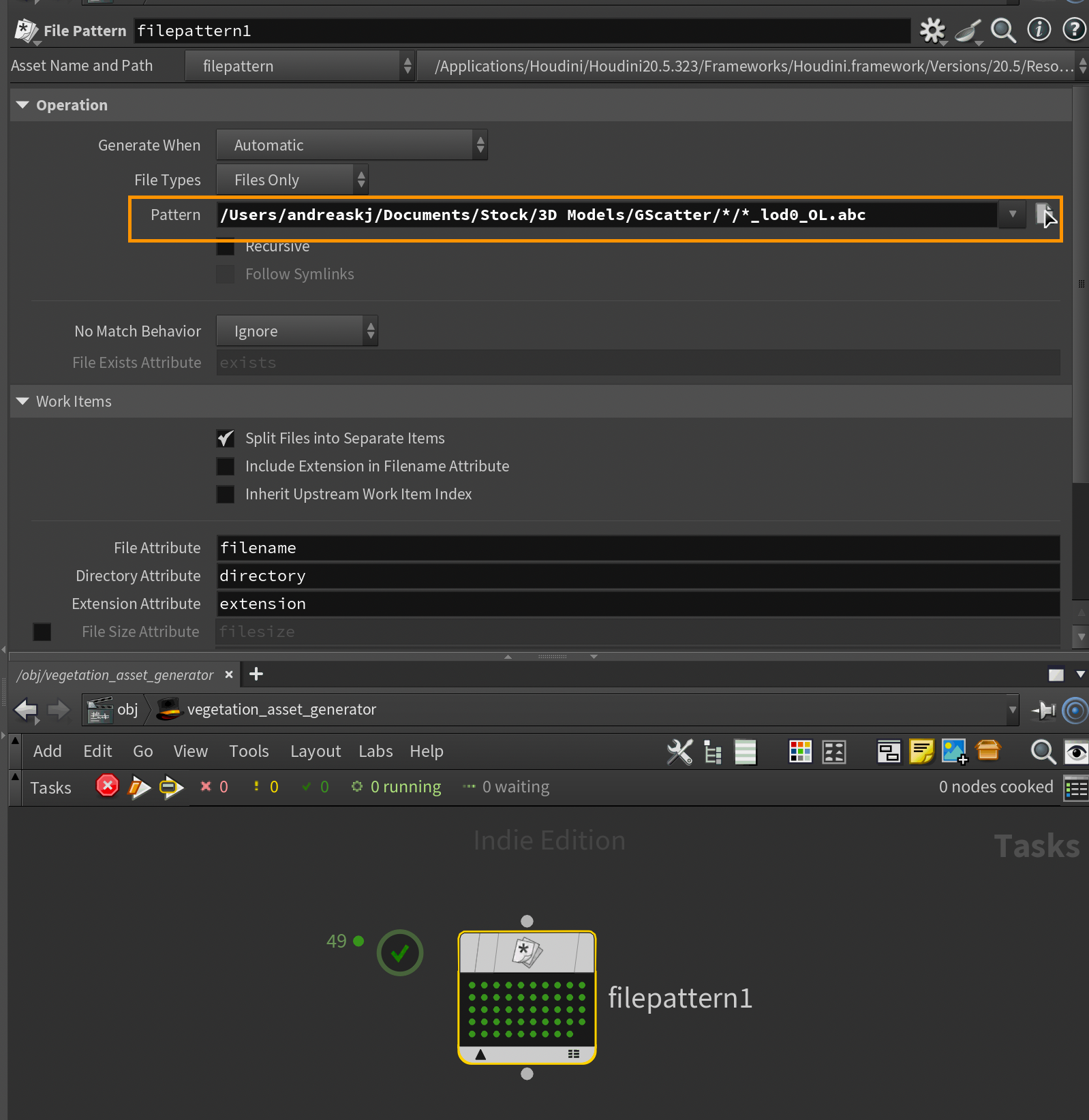 If you now select the File Pattern node and press SHIFT+V to Dirty and Cook the node, you should get a work item (represented by the green dots) for each lod0 alembic model in the specified directories. If you middle-click one of the green dots you can check the attributes generated for each work item.