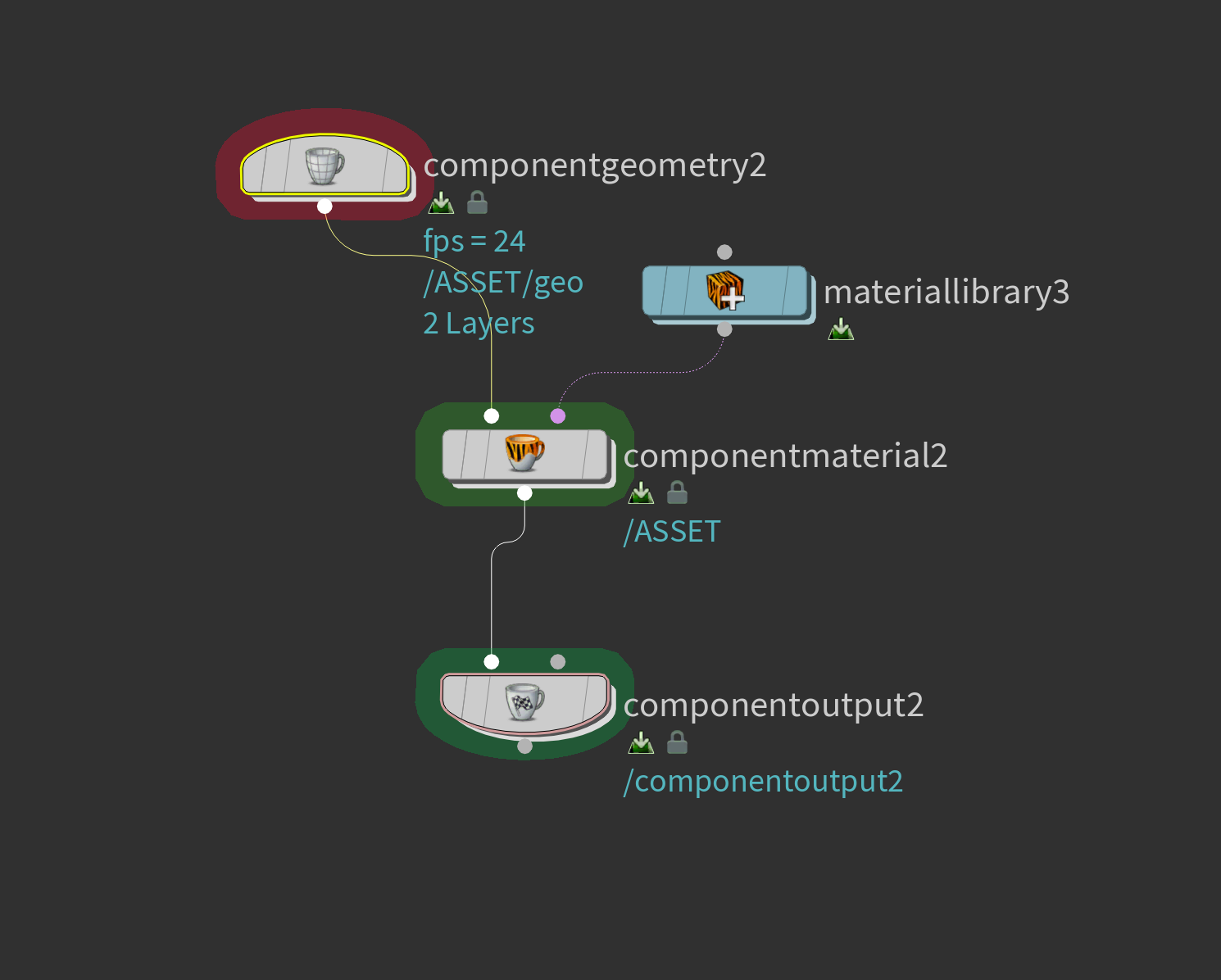 If you jump out of the material library, the Component Material node should automatically attach the output shader to the /ASSET primitive - resulting in a shader like you see below.