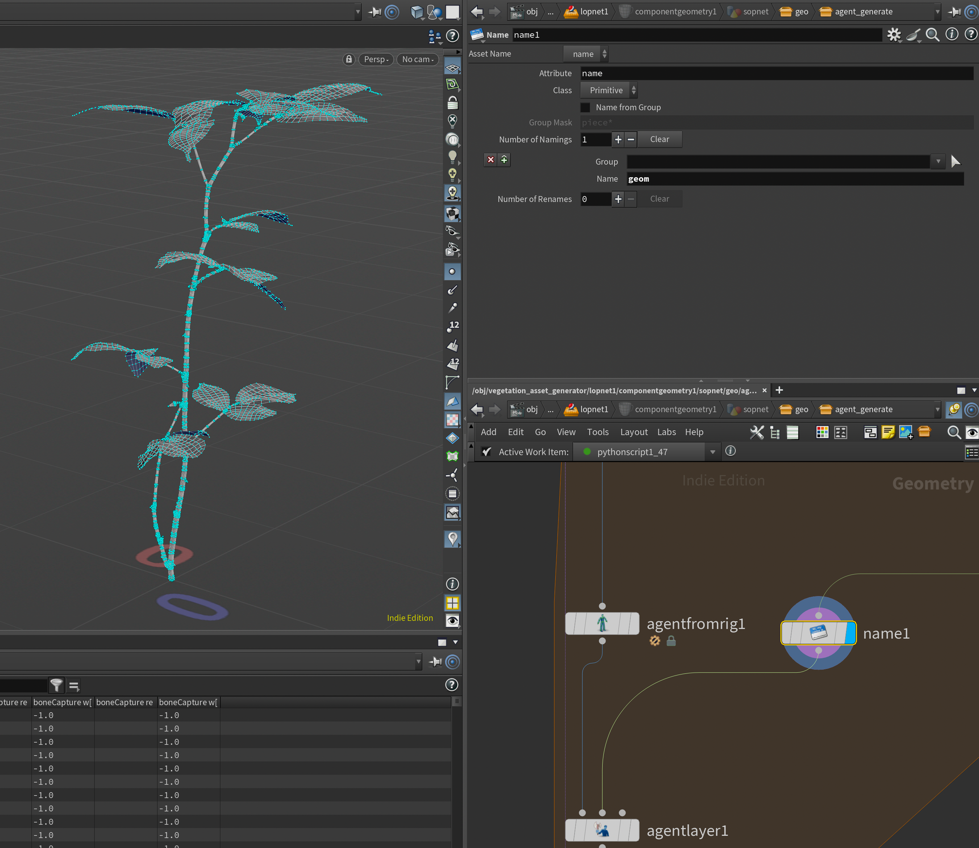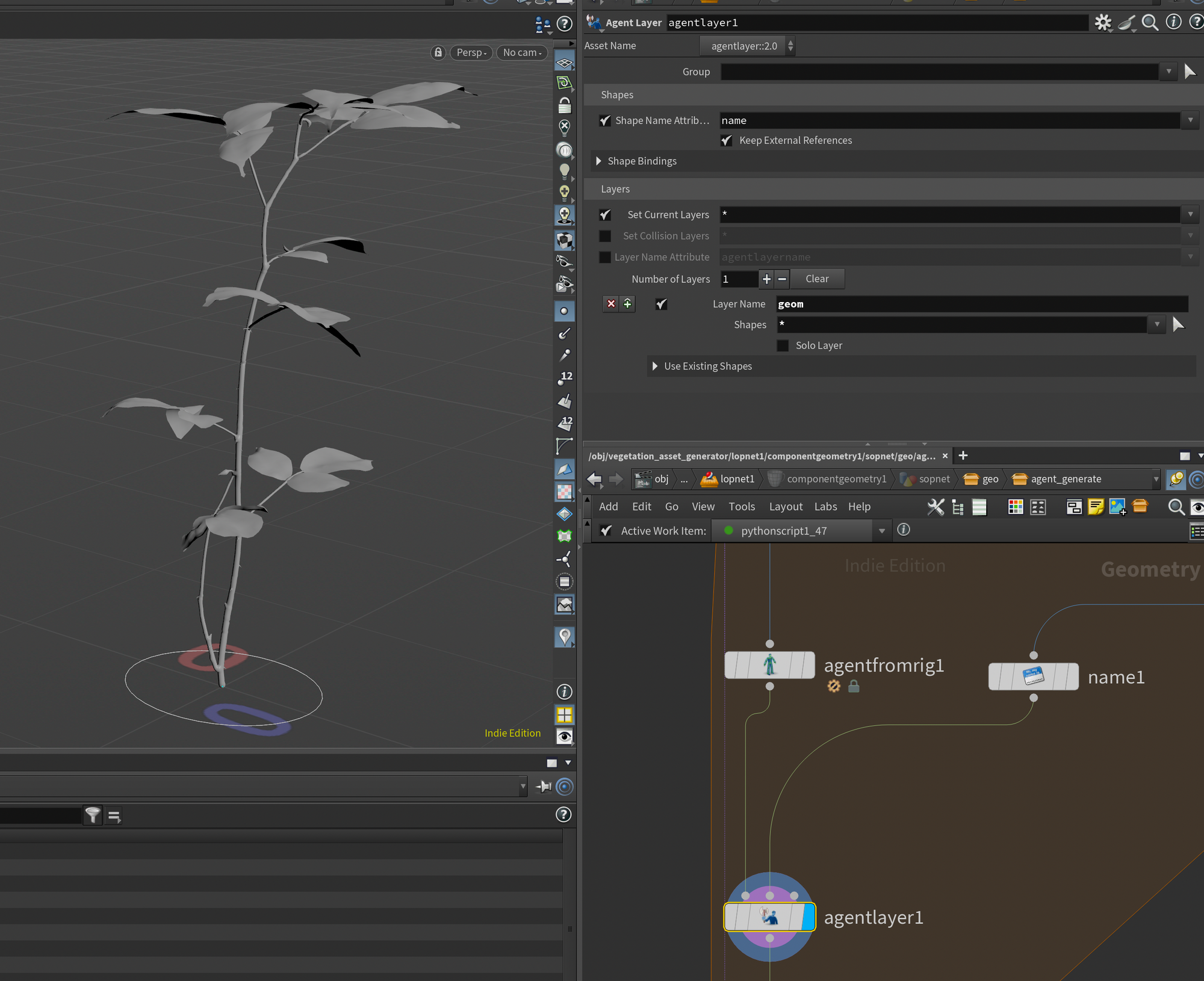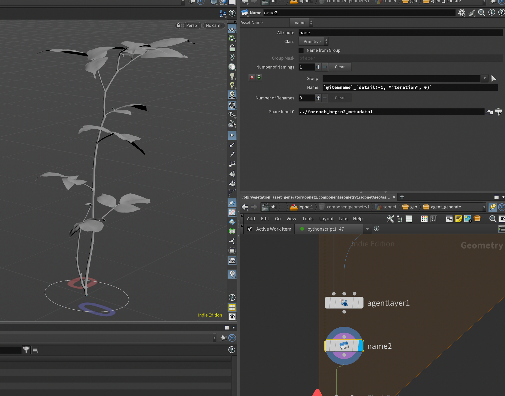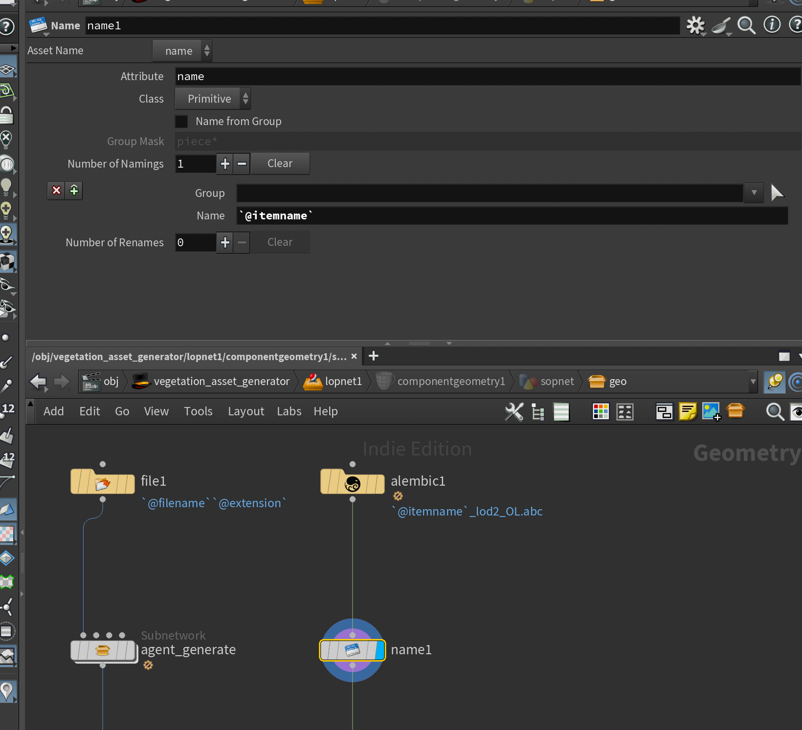 @itemname variable in the Agent Name - this is a variable we'll set up in the next step in TOPs/PDG to allow us to grab the name of the vegetation asset.Now we need to attach our geometry to our agent. This is done using an Agent Layer node. Before we do that I also name our geometry using a Name node and simply call it geom . This allows us a bit more control of the naming in LOPs.