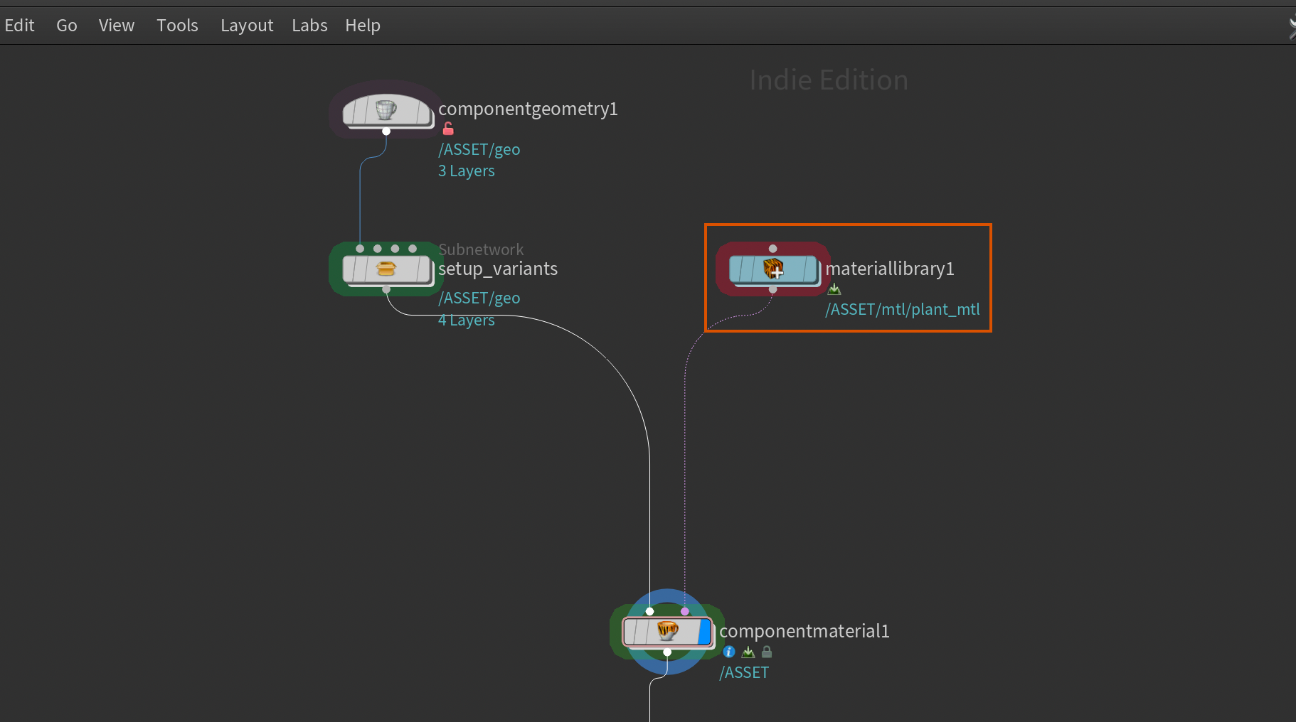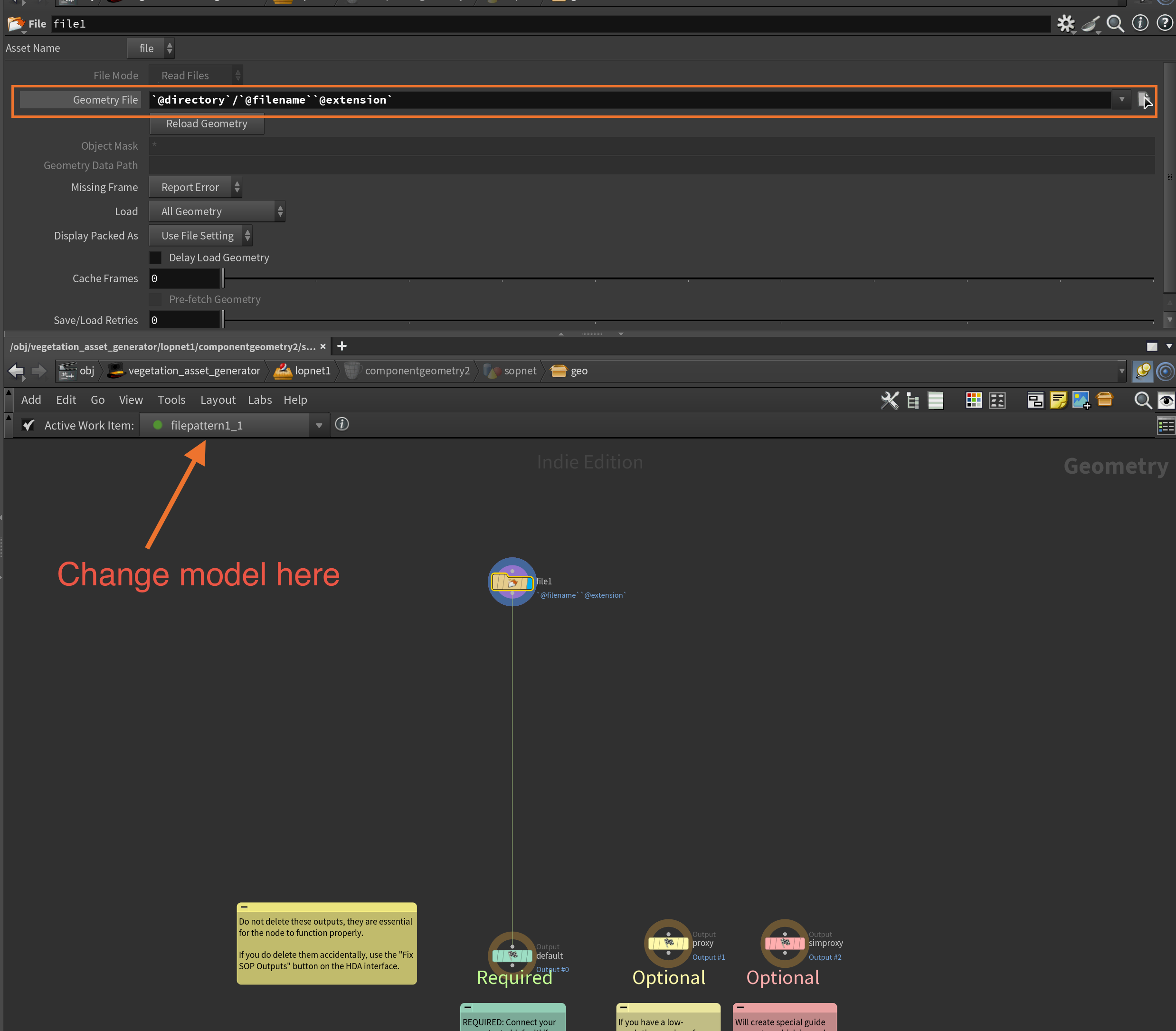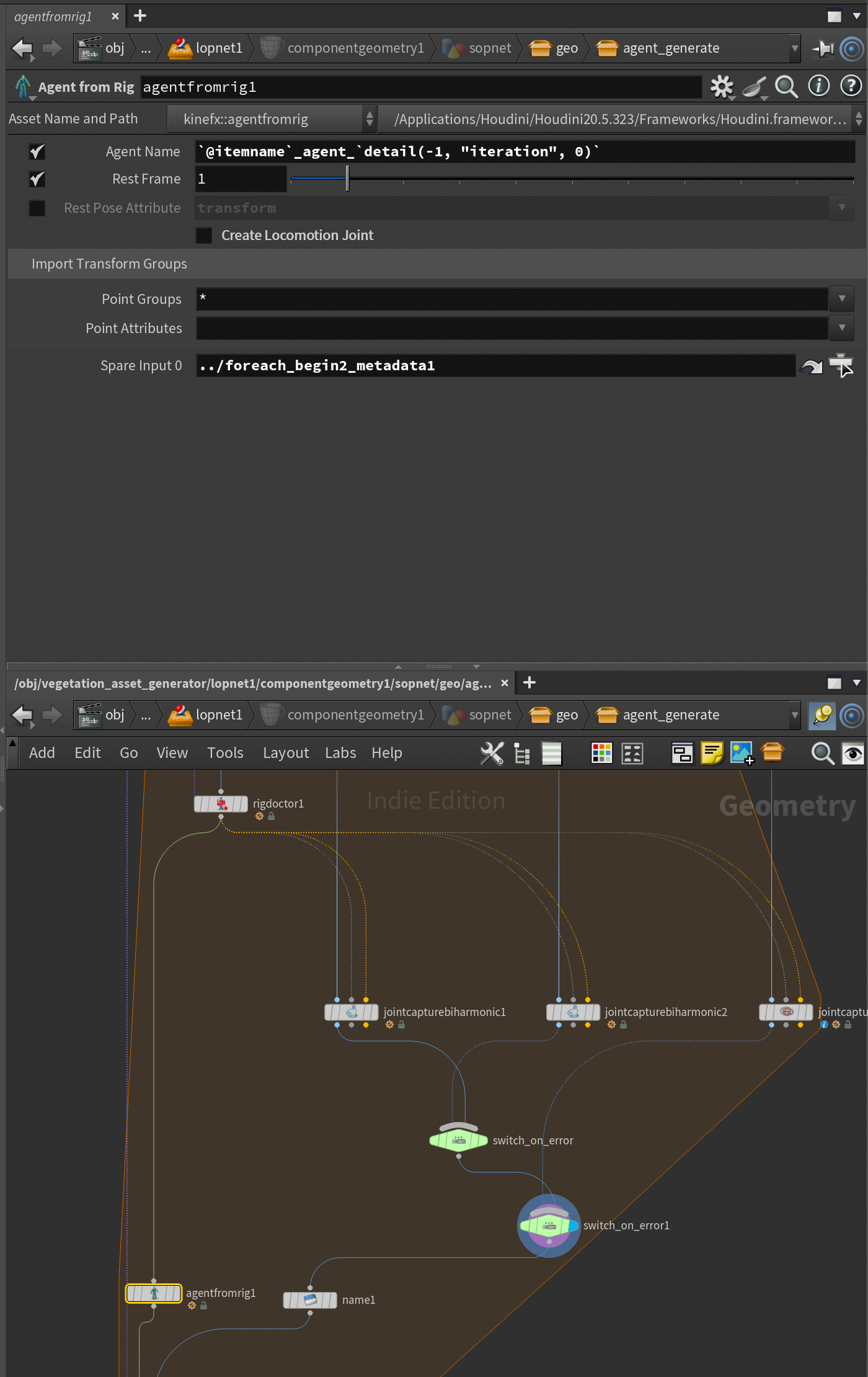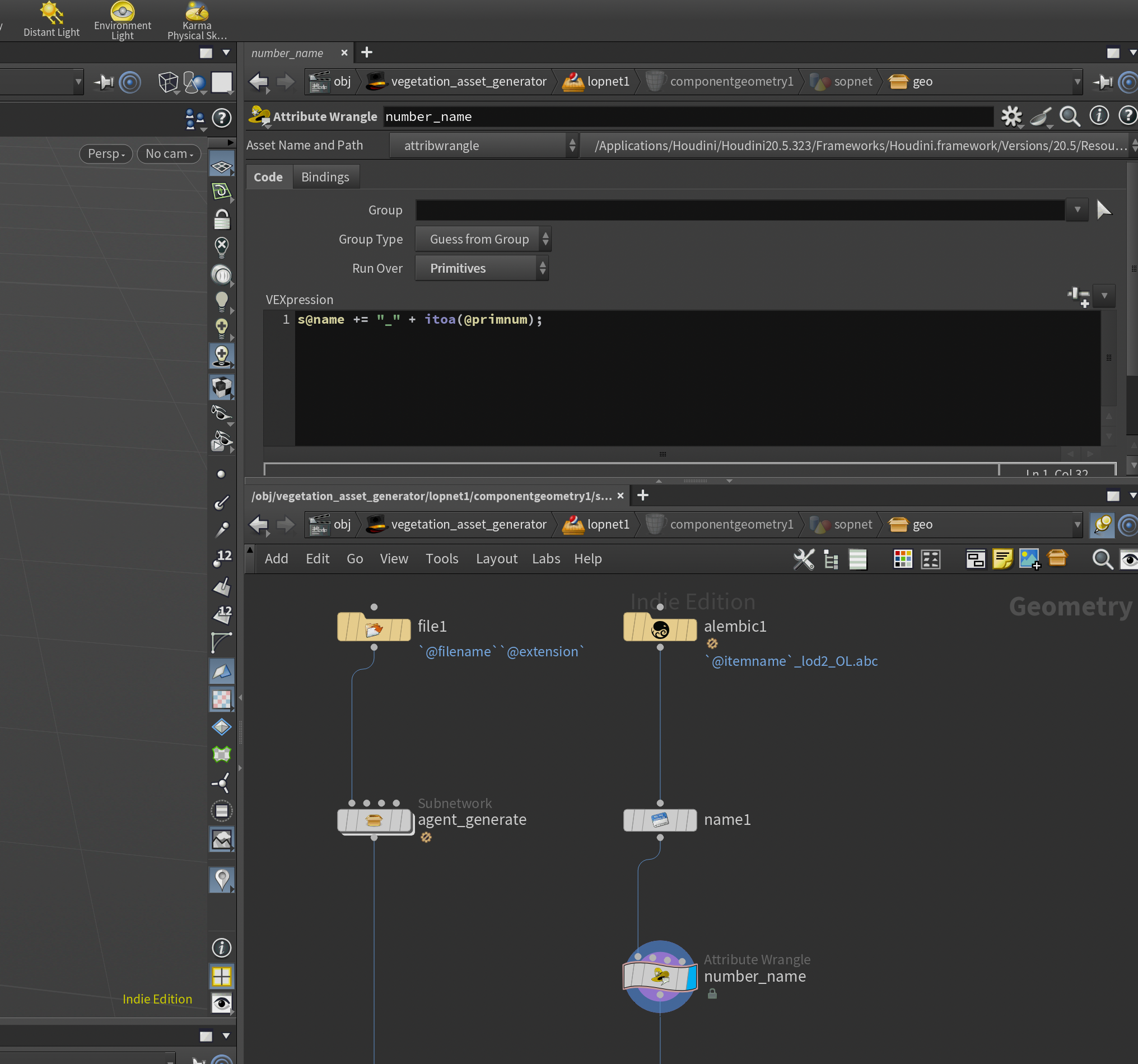@itemname variable in the Agent Name - this is a variable we'll set up in the next step in TOPs/PDG to allow us to grab the name of the vegetation asset.Now we need to attach our geometry to our agent. This is done using an Agent Layer node. Before we do that I also name our geometry using a Name node and simply call it geom . This allows us a bit more control of the naming in LOPs.