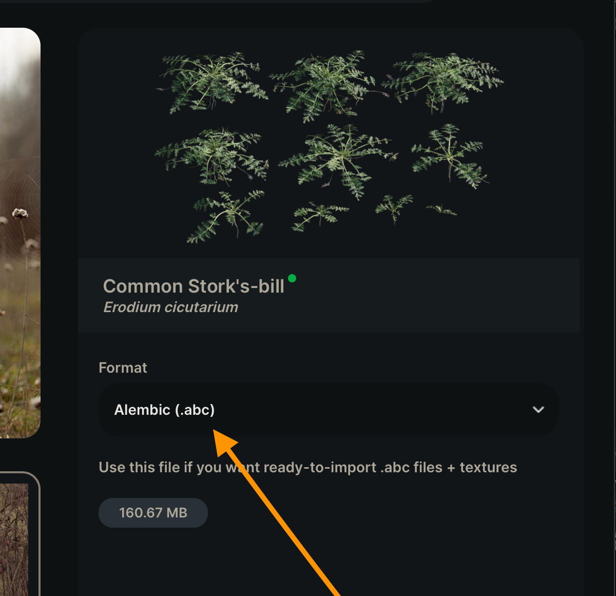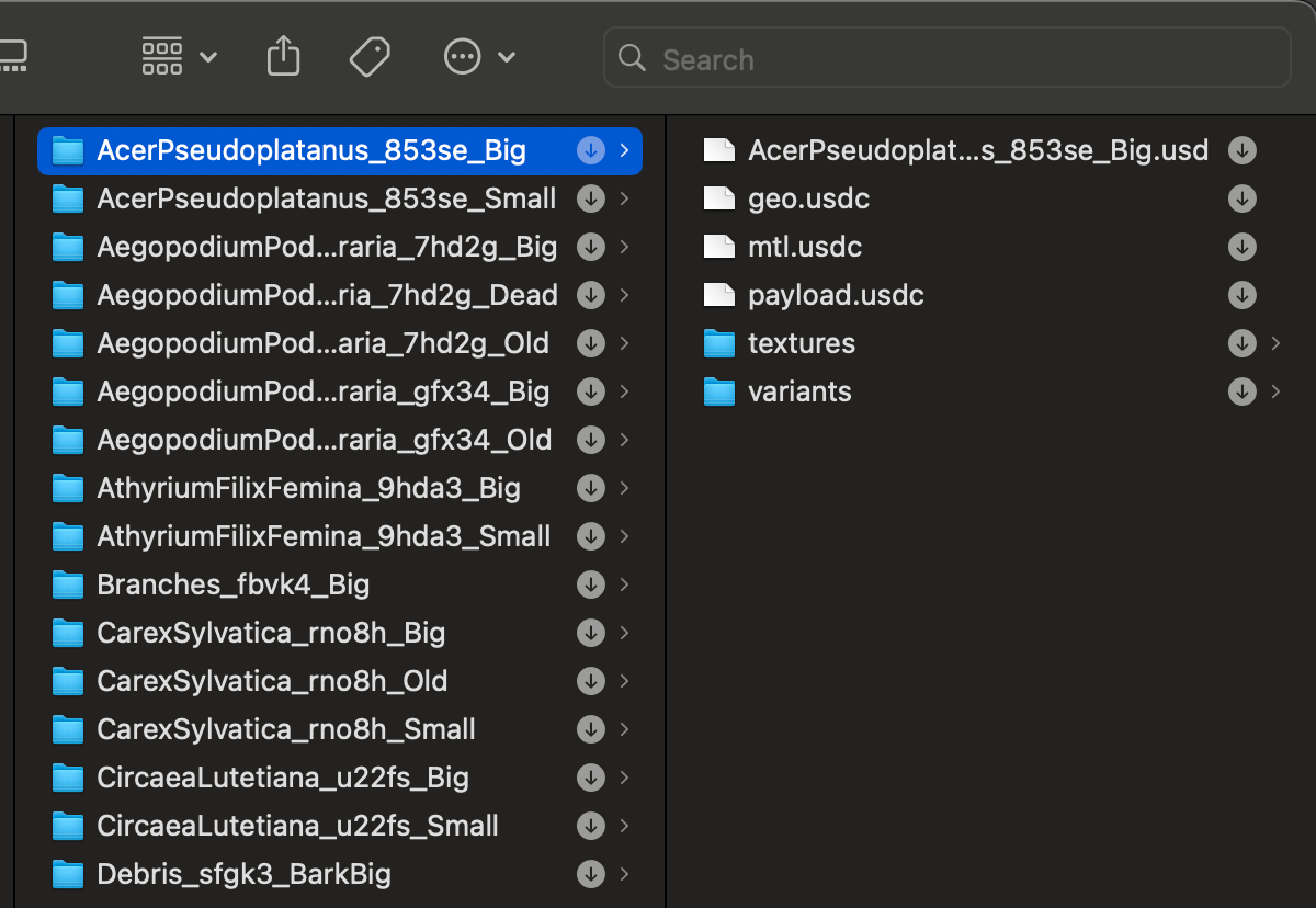 If you want to follow along you can download any of the wonderful free vegetation assets found on gscatter.com . Just make sure to download the Alembic version of the assets. If the vegetation asset contains an alembic called "Building Blocks" I recommend deleting that file before proceeding as you'll otherwise get a very large amount of additional assets (one for each "building block").