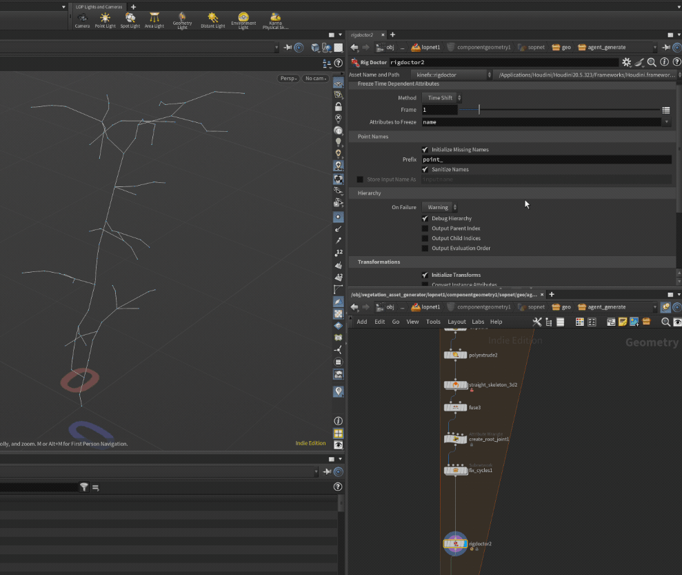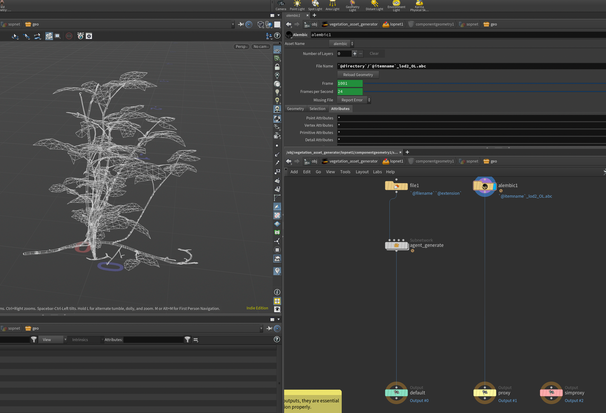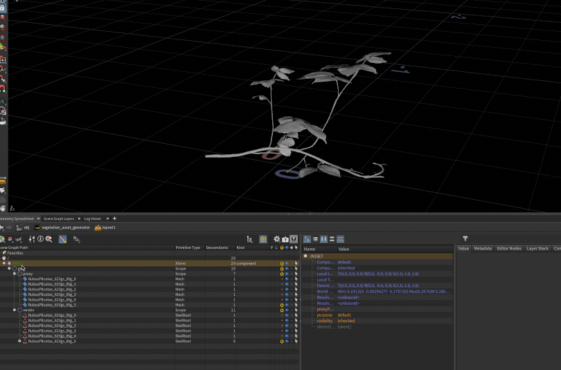 With our agent generator setup ready, we can proceed into Solaris and start setting up the actual USD assets. Our goal is to create a generic setup that we can use to batch-process any amount of vegetation models.