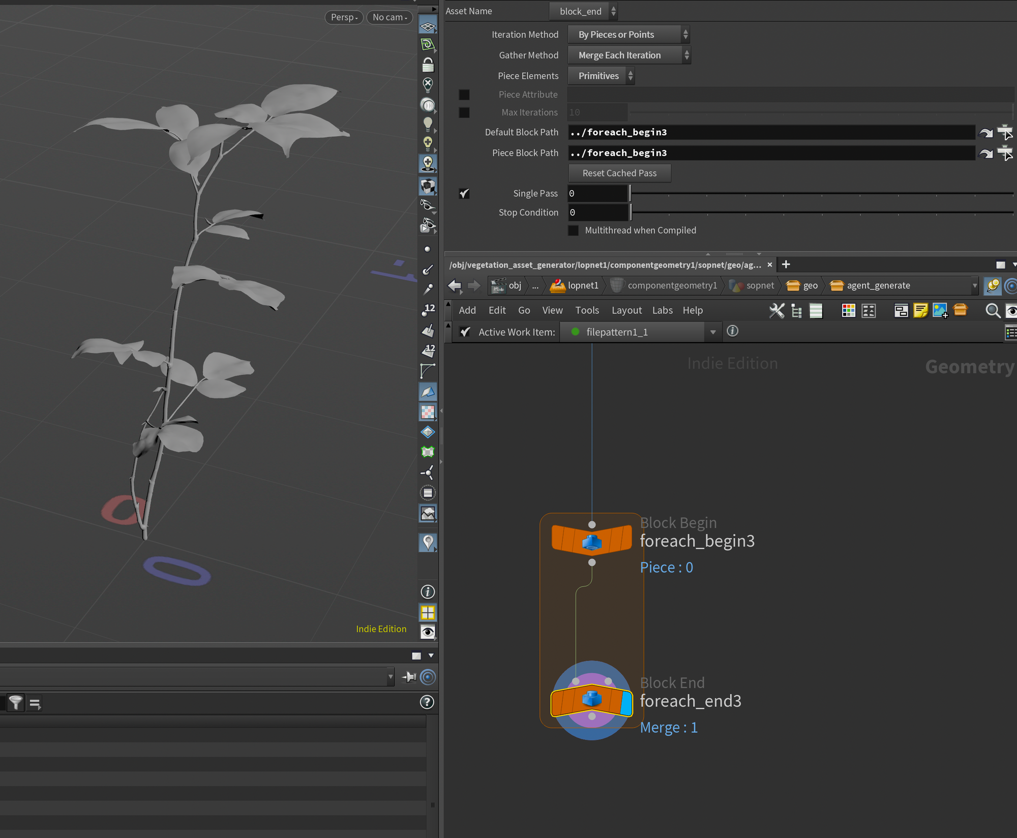 And that's it for agent generation! Now you can disable Single Pass on the For-Each End node so we can cook all the vegetation in the currently selected TOPs work item. It should look something like this - you can see we get an agent for each model.