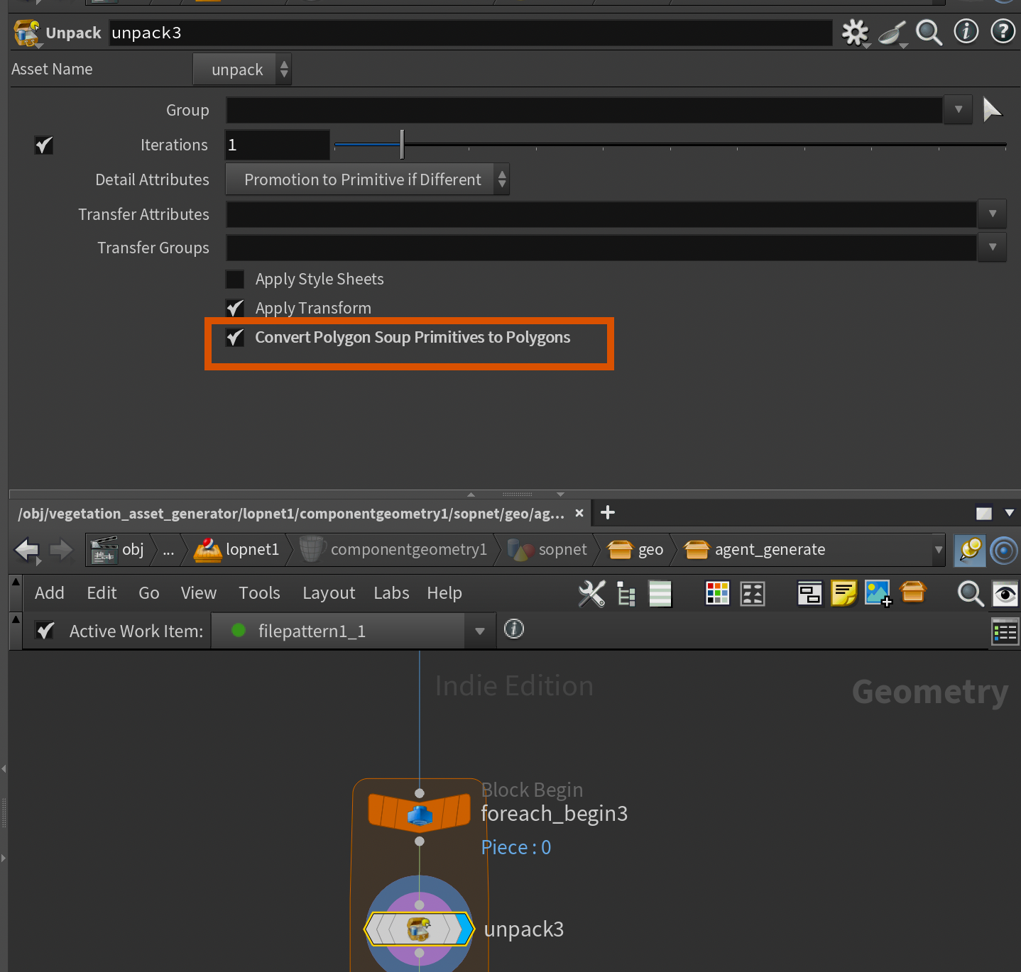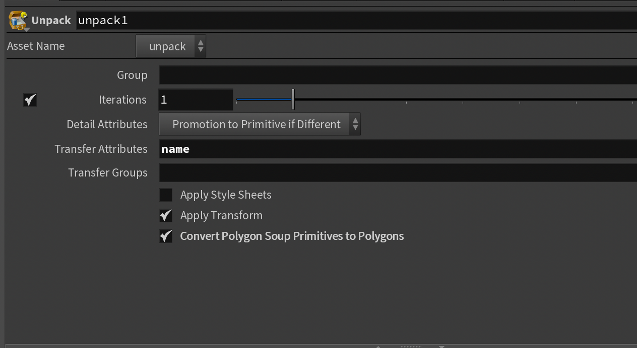 In order for our skeleton generation to work properly we'll need to first unpack the geometry using an Unpack node. Remember to toggle Convert Polygon Soup Primitives to Polygons as we need the raw geometry for generating our skeletons.