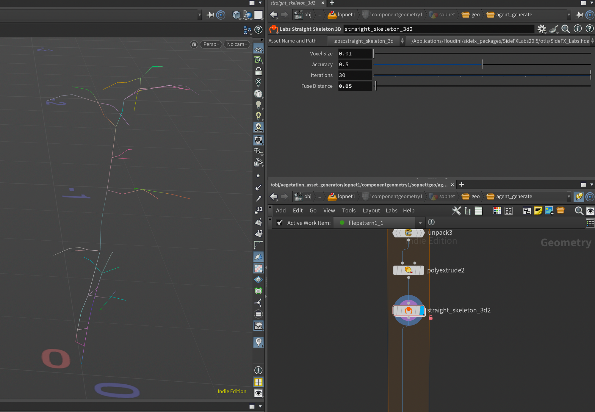 Now it's time to generate our skeletons. I tried several different techniques, even tried to build my own generator. But eventually I ended up settling with the built-in Labs Straight Skeleton 3D . This node works surprisingly well, and just needed a tiny adjustment for my use-case.