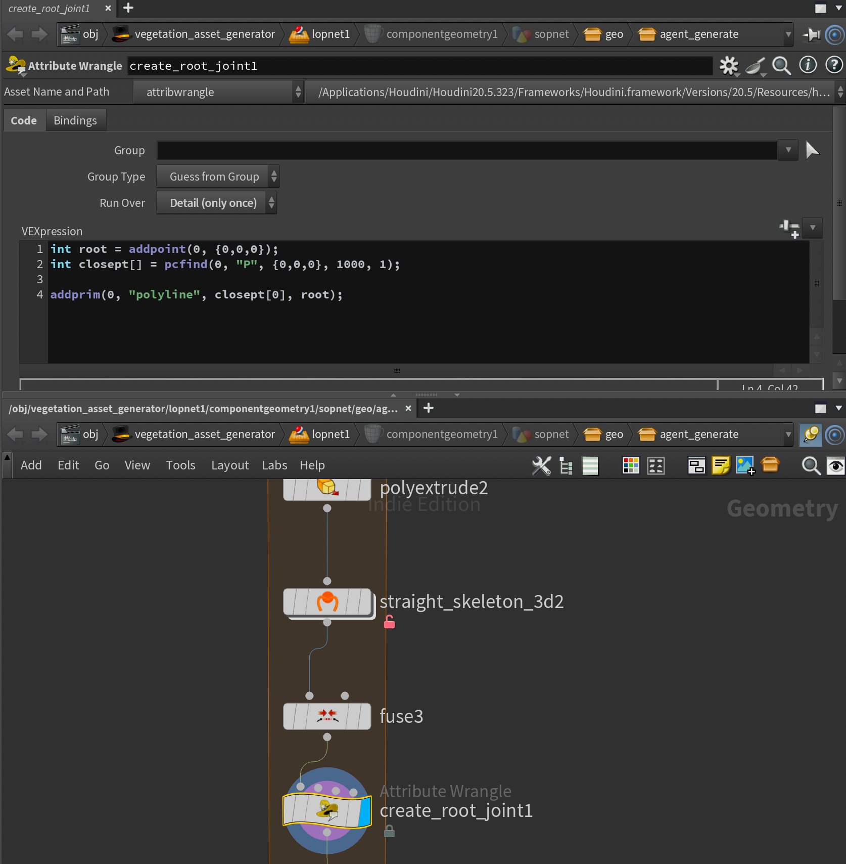 After that, I defined an additional root joint placed at the origin using a wrangle set to run over Detail. This snippet simply adds a point/joint at the origin, and connects that joint to the closest point in the skeleton.