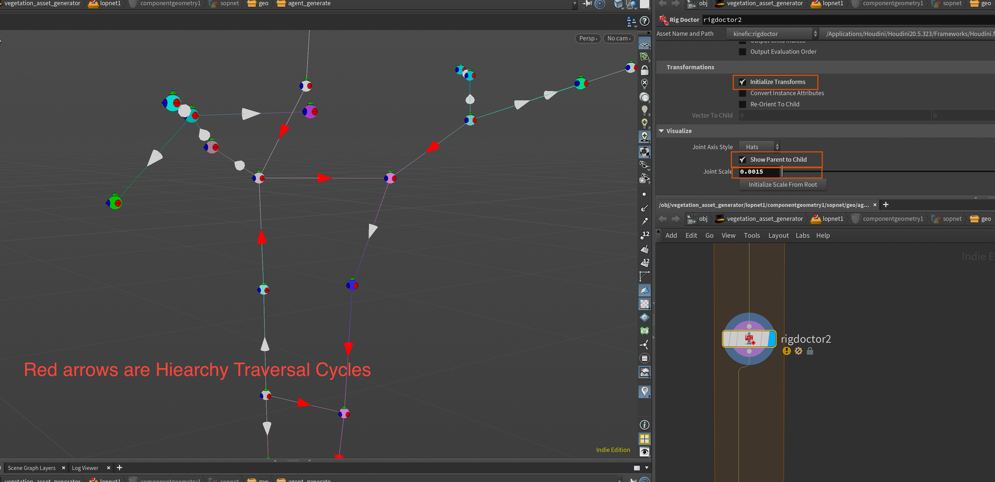Now, if you were to connect a Rig Doctor node to this setup to initialize the skeleton you'd immediately get a warning about hierarchy cycles. While this is just a warning in the Rig Doctor node, it will actually cause our agent generation to fail, so we need to fix it. In the next section, I'll cover how to clean it up, and what hierarchy traversal cycles are.
