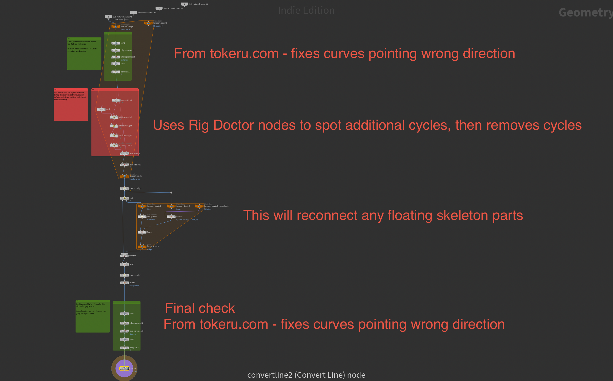 I've attached a little breakdown below as there's quite a few steps to this. But essentially it starts off by fixing any curves that are pointing the wrong direction by fixing the vertex order (courtesy of https://www.tokeru.com/cgwiki/HoudiniKinefx.html ). Then I used parts of the Rig Doctor node to spot any additional cycles and remove them. I then reconnect any floating skeleton parts, and finally do a final tech check fixing any remaining curves pointing the wrong direction.