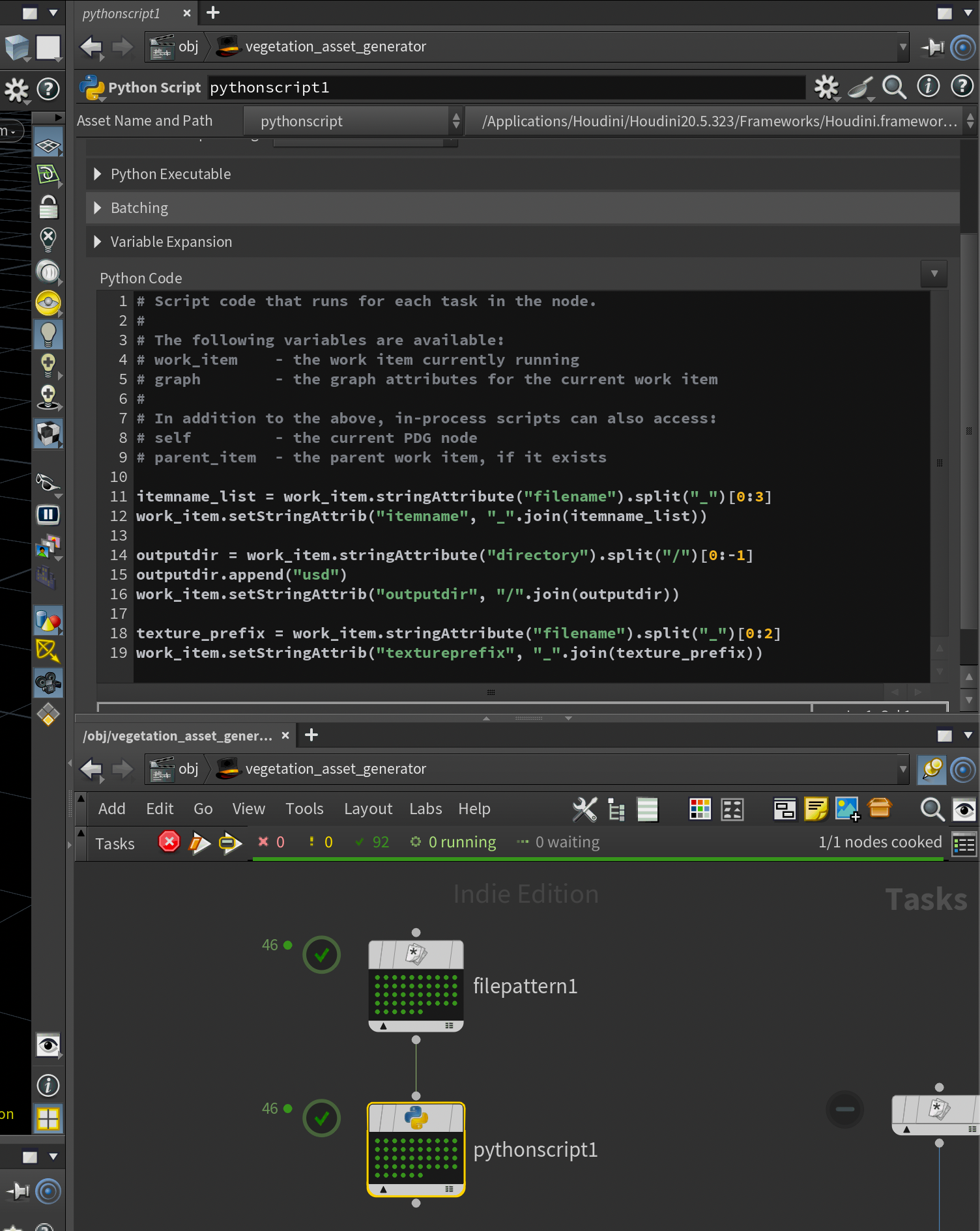 In order to get the @itemname to work, we need to add a little Python node in TOPs to initialize this custom variable. So, go back to TOPs and add a Python Script node with the following code: