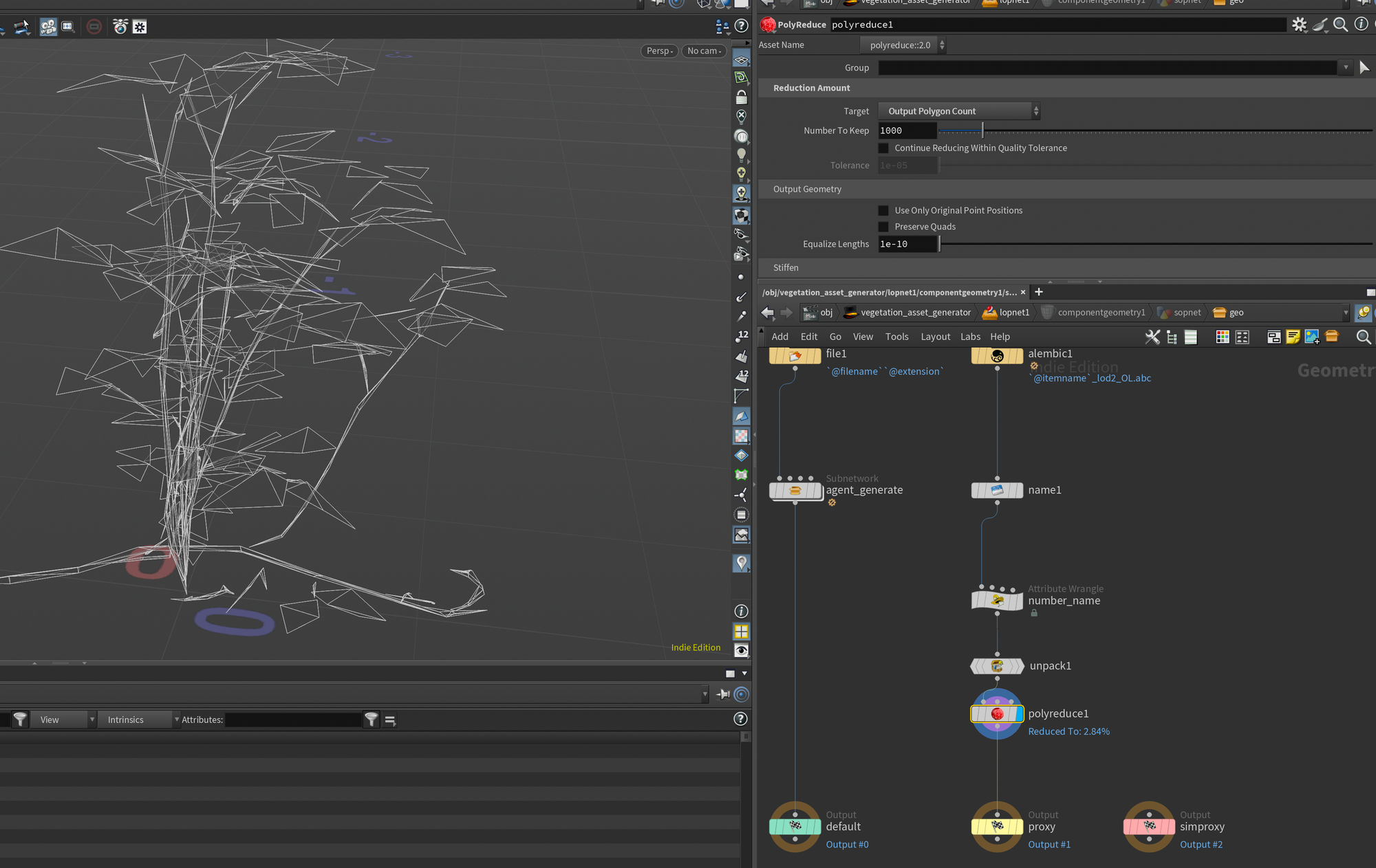 Component Geometrynode. Notice that I'm loading lod2 instead of lod0.Next, we need to setup some naming attributes to get the geometry ready for LOPs. I created a Name node set to @itemname to once again fetch the name of our current item from TOPs.