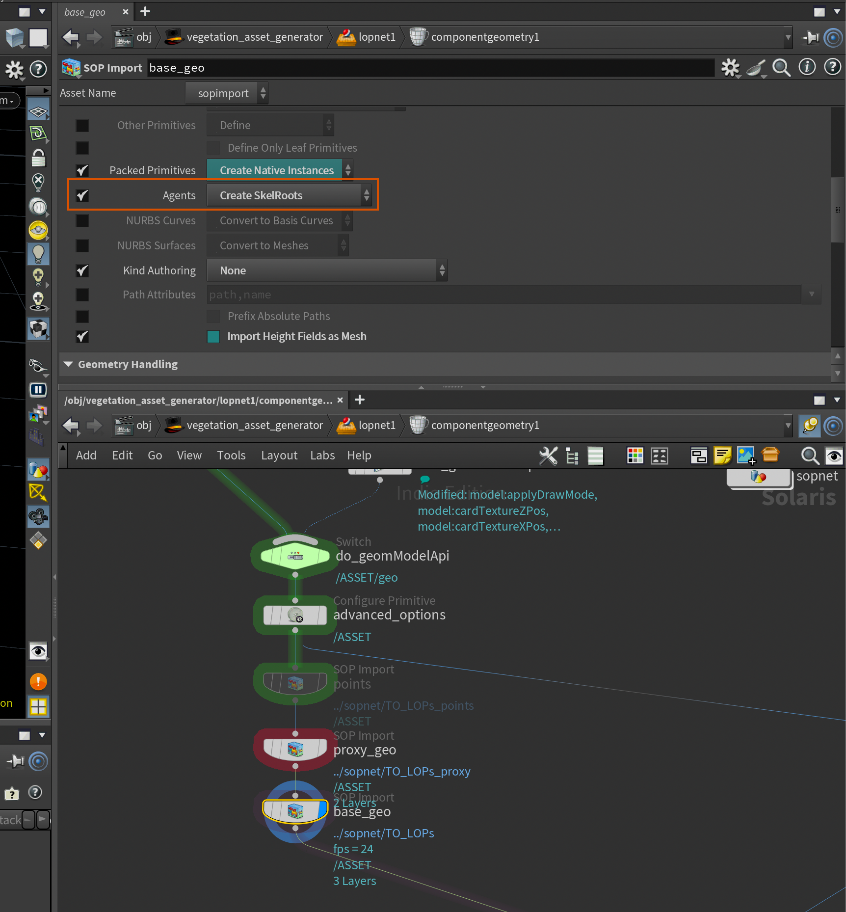 Now, if you want to be extra clean you may want to get rid of the agentdefinitions Scope - this is because by default the SOP Import treats agents like a crowd - meaning we get instances inheriting from the agent setups in the agentdefinitions Scope. In order to fix this we unfortunately need to edit the Component Geometry node and go to the base_geo node, and change Agents to Create SkelRoots instead of the default Create Instanced SkelRoots.