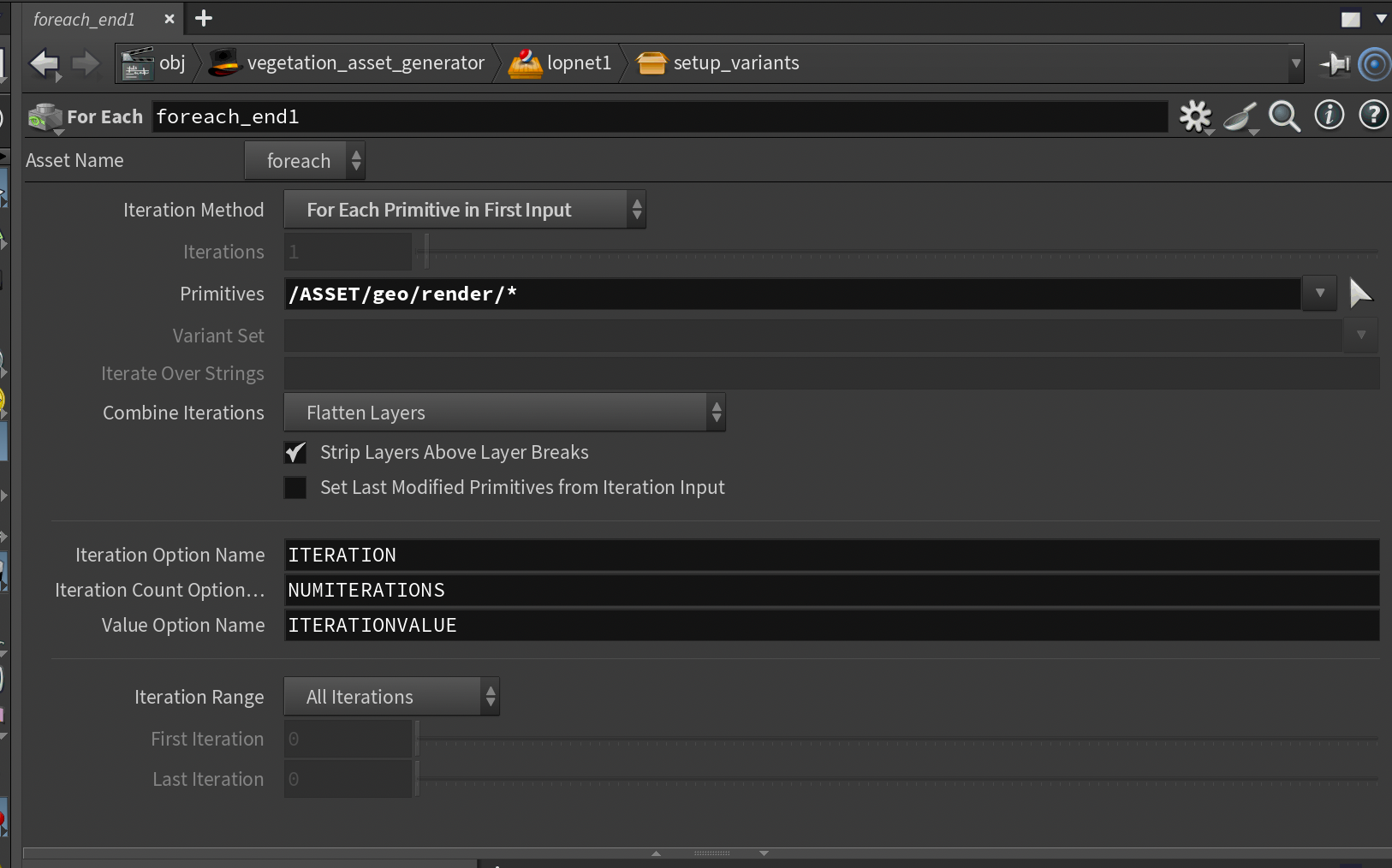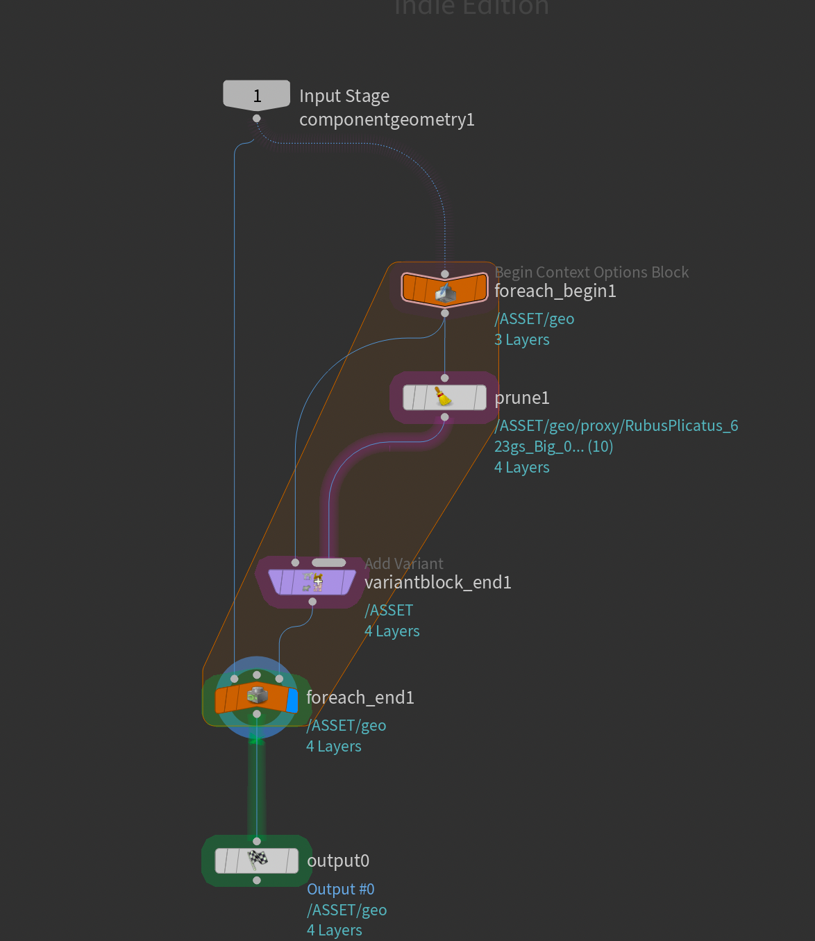 Inside the setup_variants network I created a for-each loop like you see below. The goal with this for-each loop is to take each primitive in the /ASSET/geo/render/* scope and create a variant based on each selected primitive. This is very reminiscent of how I setup variants for the assets in my other tutorial here: