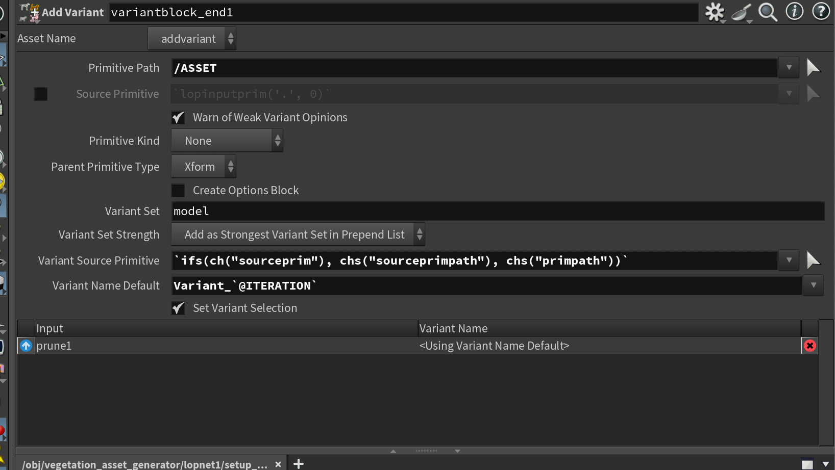 Next, in the variantblock_end (created from tab-menu with Add Variants to Existing Primitive) we first need to disable the Create Options block and delete the variantblock_begin node. Then, we need to set the Primitive Path to /ASSET since we want to target the top primitive that the Component Geometry node generates (we want to be able to select our variant from this prim).