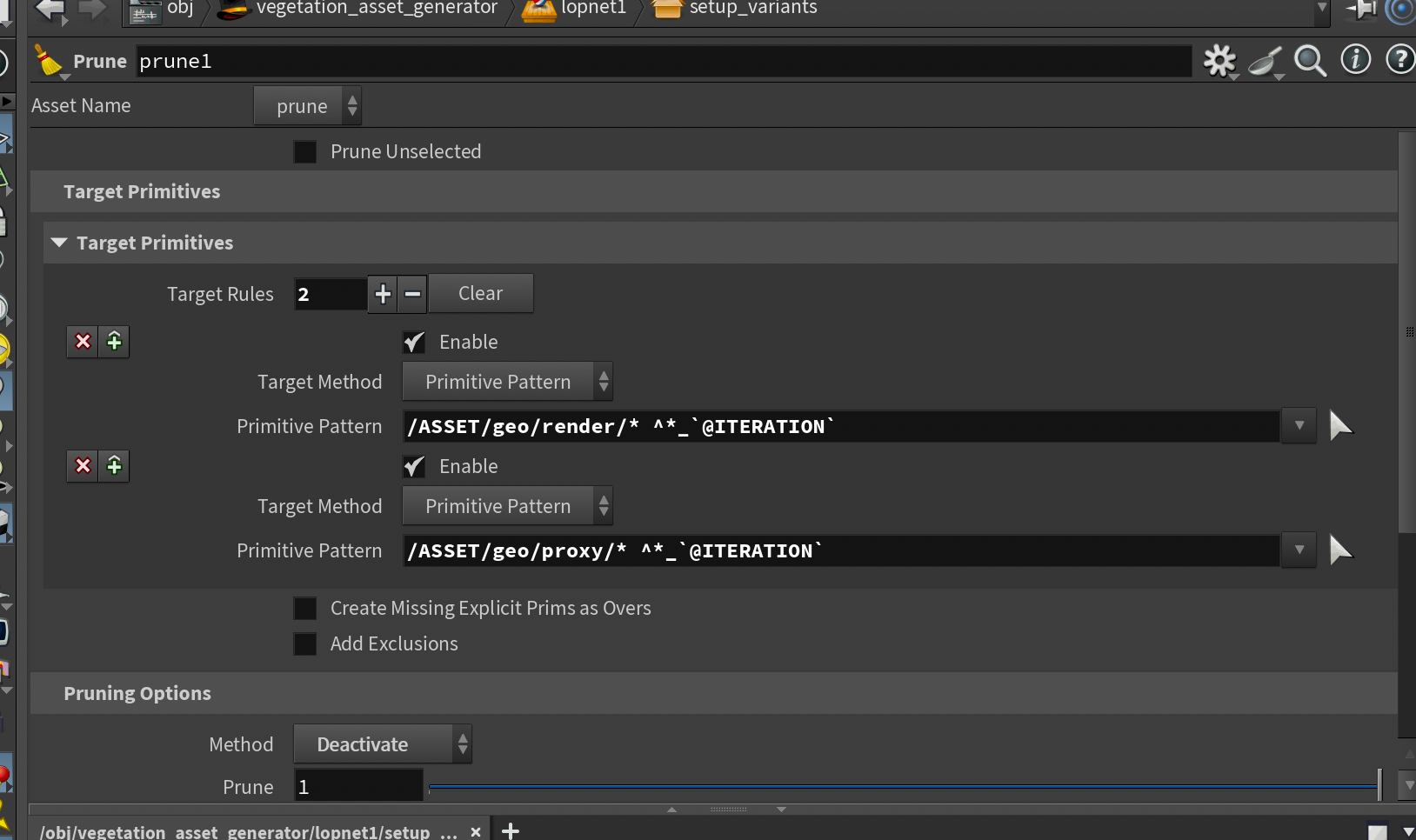 Finally, we have the Prune node. This will isolate only the primitives that we want for our current variation. Set the Method to Deactivate and add two Target Rules set to the following: