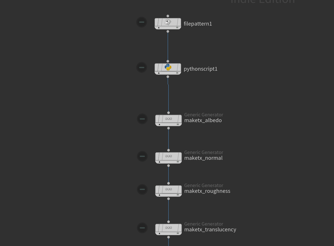 With all 4 nodes setup and chained together you can select the last node (in my case maketx_translucency, and press SHIFT+V to start cooking all of them. This will populate your asset directory with mipmapped textures ready to use in your shaders.