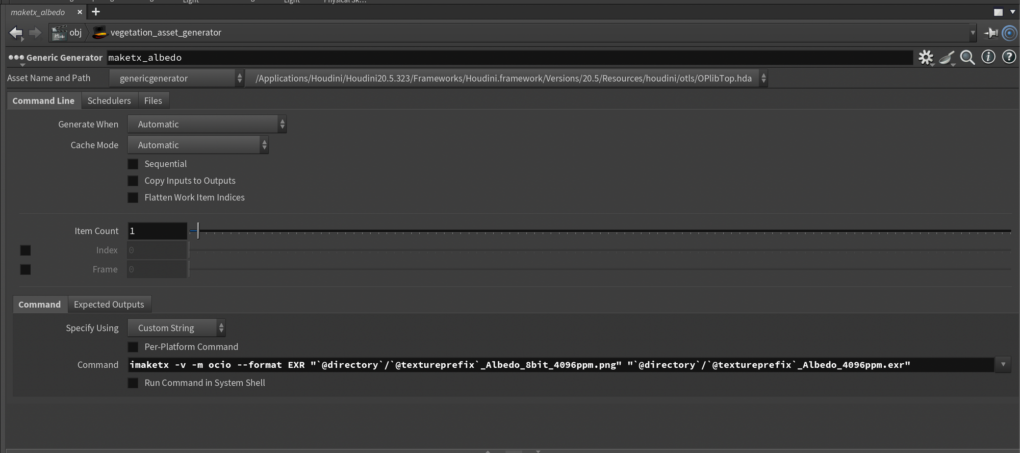 In order to do this we'll attach 4 Generic Generators back in our TOPs network. Each of these will be responsible for processing the corresponding map for each vegetation asset. The Generic Generators in TOPs are generally just used to run a custom terminal command - in our case imaketx which is a built-in command line tool for generating mipmapped textures. It's the same one that Karma runs anytime it detects non-mipmapped textures in your render.