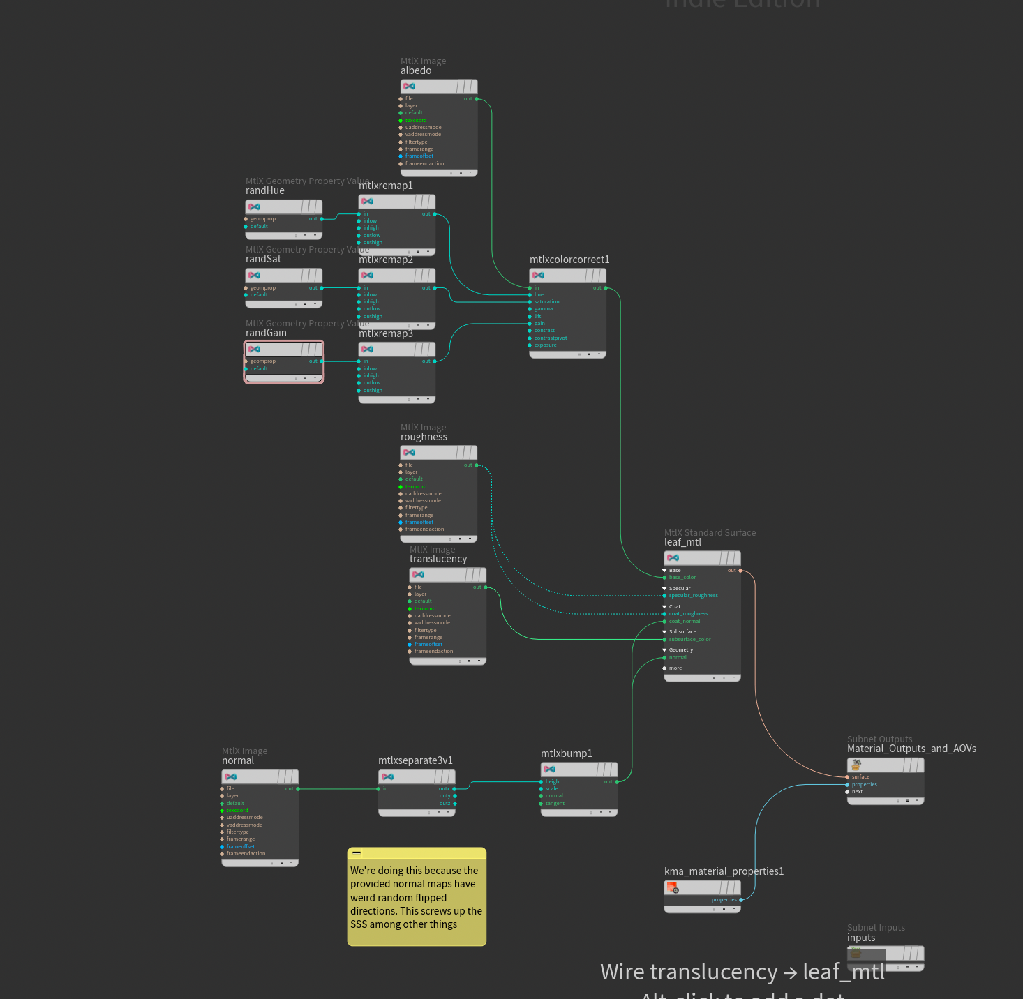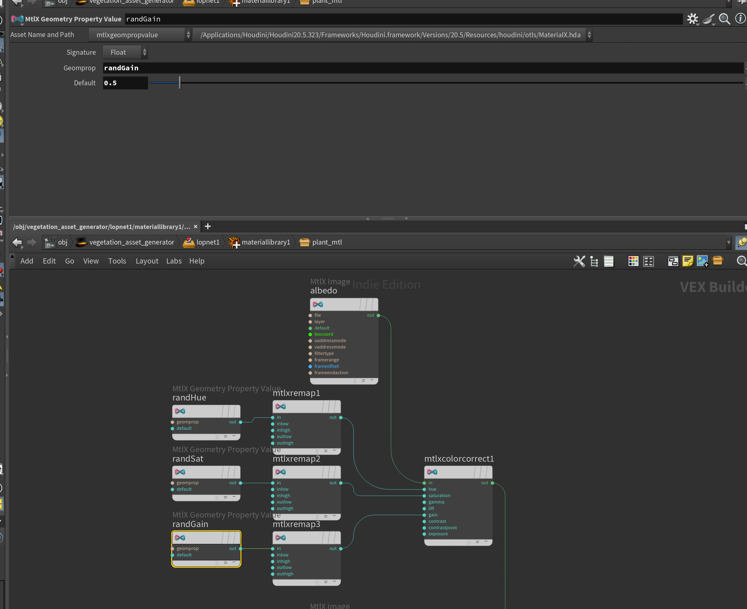 I did this so I can vary the hue, saturation, and gain between vegetation instances by adding the same attribute with a random value for each instance of vegetation. This helps create variation in our shading. All of them are set to 0.5 by default. After each MtlX Geometry Property Value I also plugged in a MtlX Remap remapping the Outlow and Outhigh to some sensible values (basically the min and max hue/saturation/gain that I want).