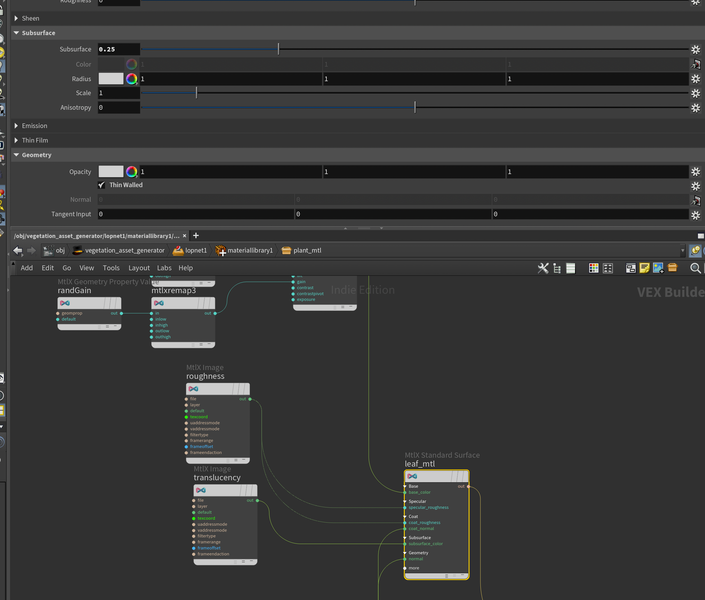 Finally, in order for the SSS to work (I use translucency as the SSS color) I set the Subsurface to 0.25 in the MtlX Standard Surface and turned on Thin Walled. This helps us add the nice translucency effect you get when light passes through leaves.