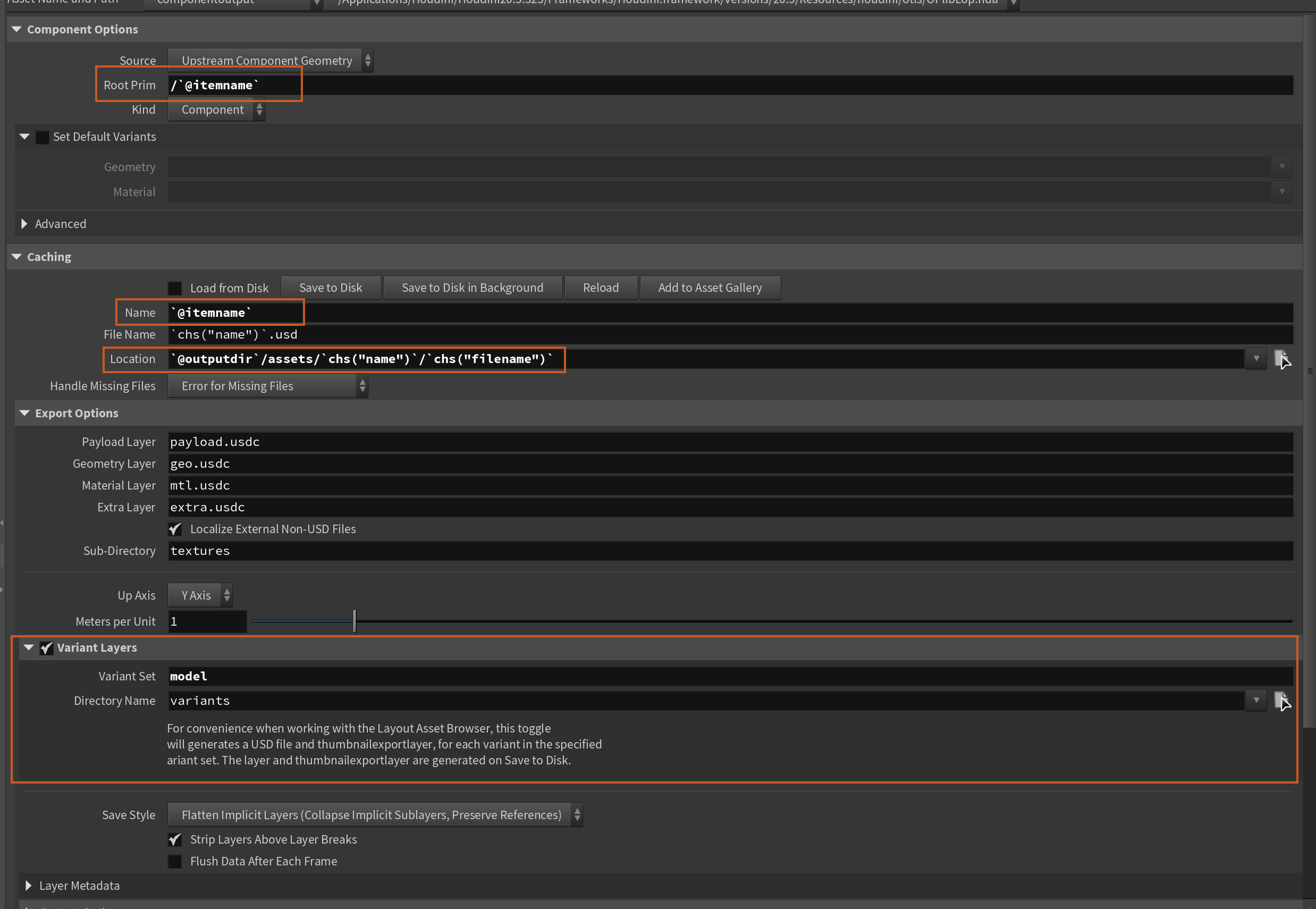 We also need to do the same to the Name parameter under Caching, setting it to the following so the .usd files are appropriately named.