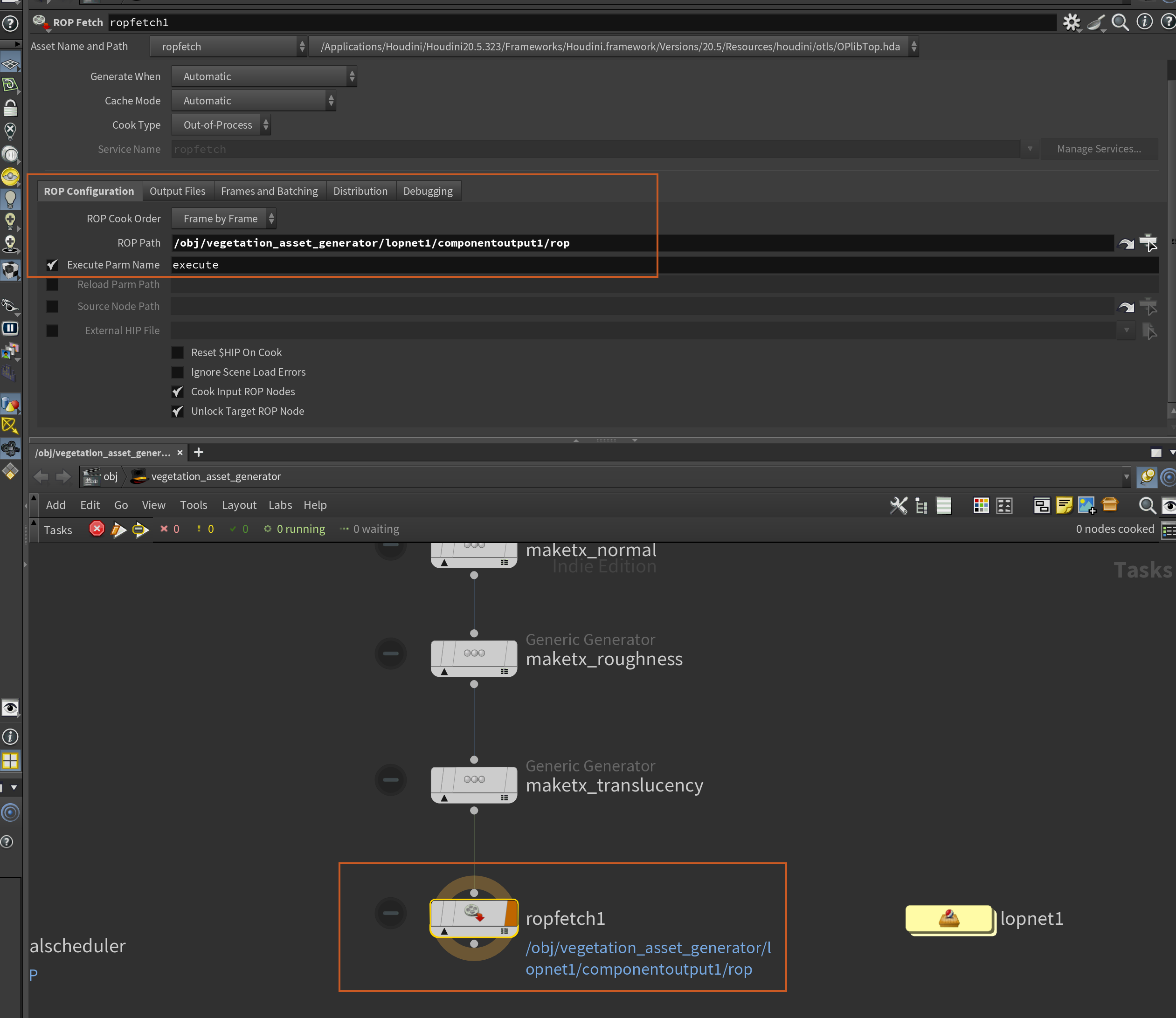 Back in TOPs, we simply need to add a ROP Fetch node to the end of our TOPs network that points to the ROP inside of our Component Output node as seen below. This will enable us to batch-export each vegetation asset through this LOP network and write it out to disk.