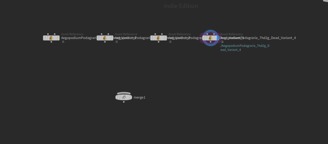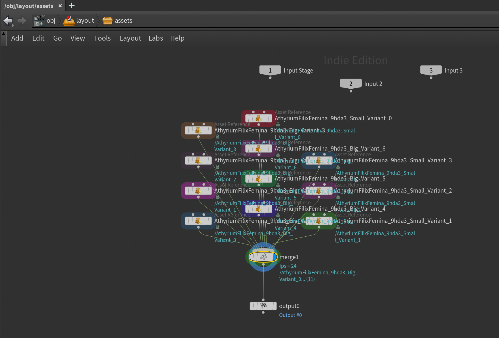 Each asset subnetwork looks something like below, and is simply all of the assets loaded into a merge. This is honestly quite a messy look, but it's the simplest way I've found to add multiple assets from the Layout Asset Gallery in Houdini without relying on the Layout LOP (which I didn't end up using in this case). If you wanted to be cleaner, you could load each asset manually and do a for-each to split out the variants (similar to my previous article: https://www.andreaskj.com/coming-soon/#layout-amp-rendering-with-karma ), but then you lose the drag-and-drop functionality.