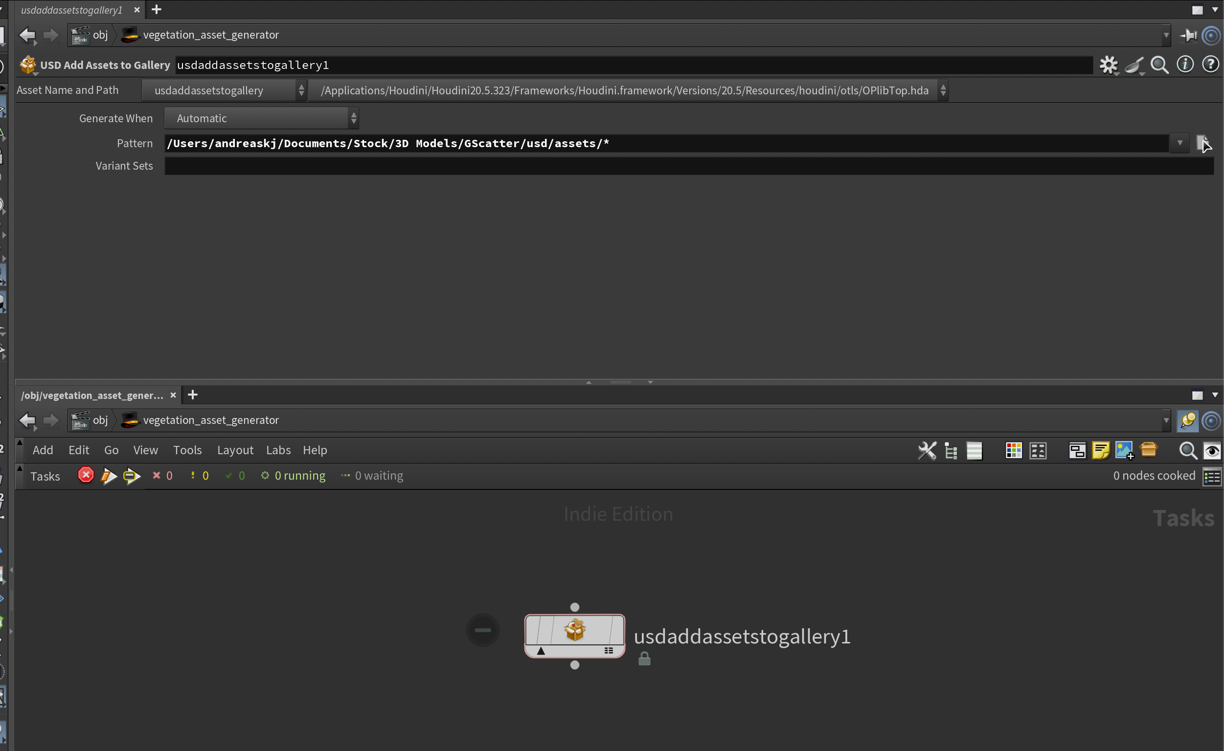 There are multiple ways to add assets to the Layout Asset Gallery, but since we're already in TOPs, the easiest by far is to use the USD Add Assets to Gallery node. This node allows you to specify a root directory with all your assets (in our case, the /assets folder generated from the component builder setup) and add all of the nodes to a Layout Asset Gallery database.