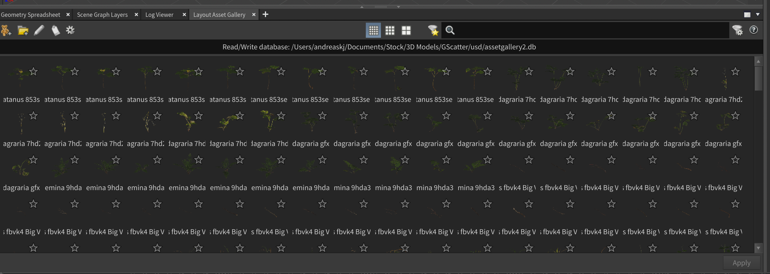 Starting where we left off, the first thing we need to do is to add our assets to the Layout Asset Gallery (or Asset Catalog in Houdini 21). We do this to help us have a nice overview of all our processed assets, and to enable us to visually pick which assets we want to use in our scene.