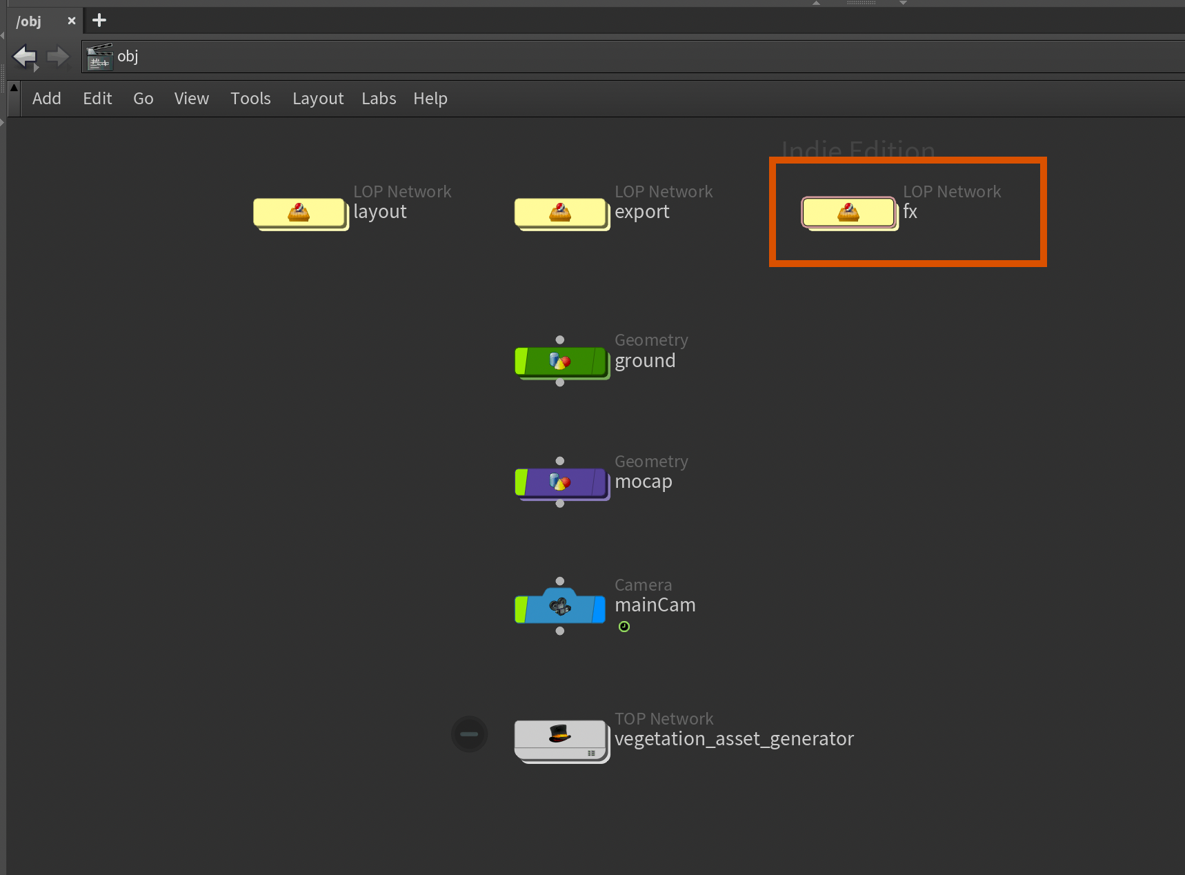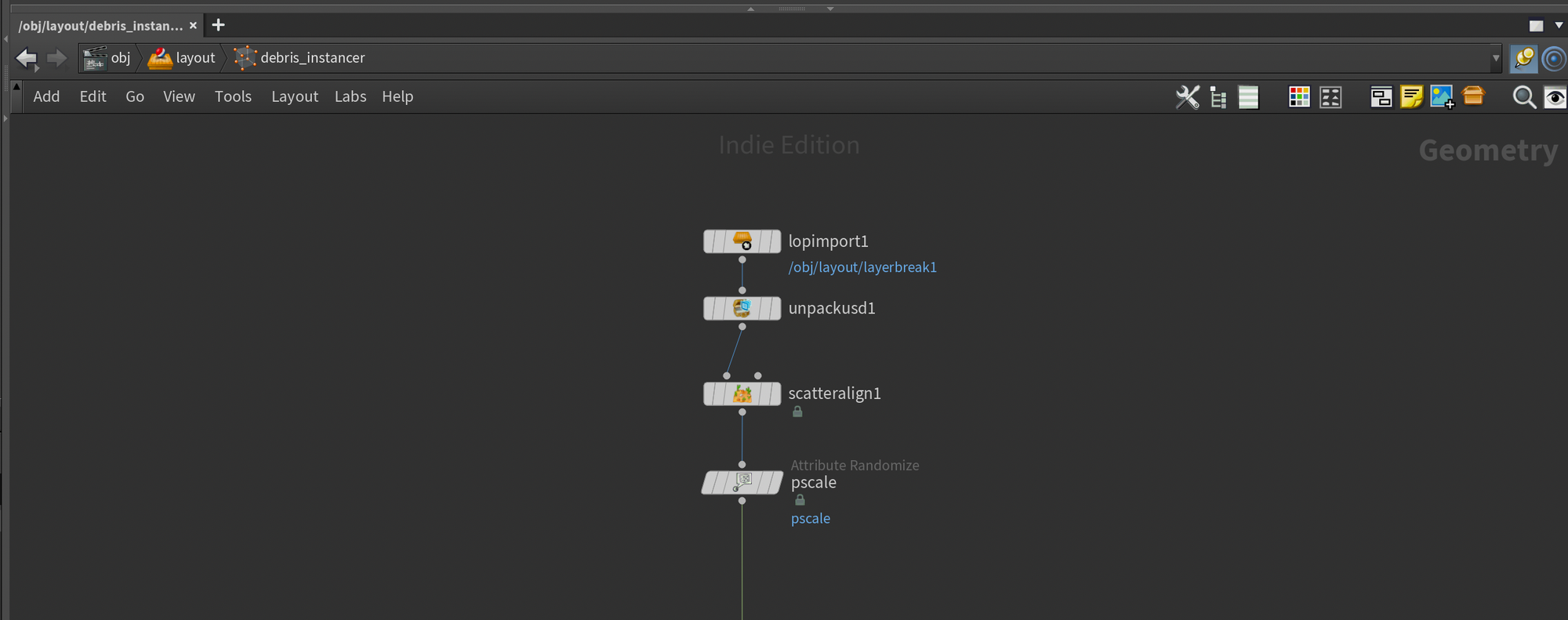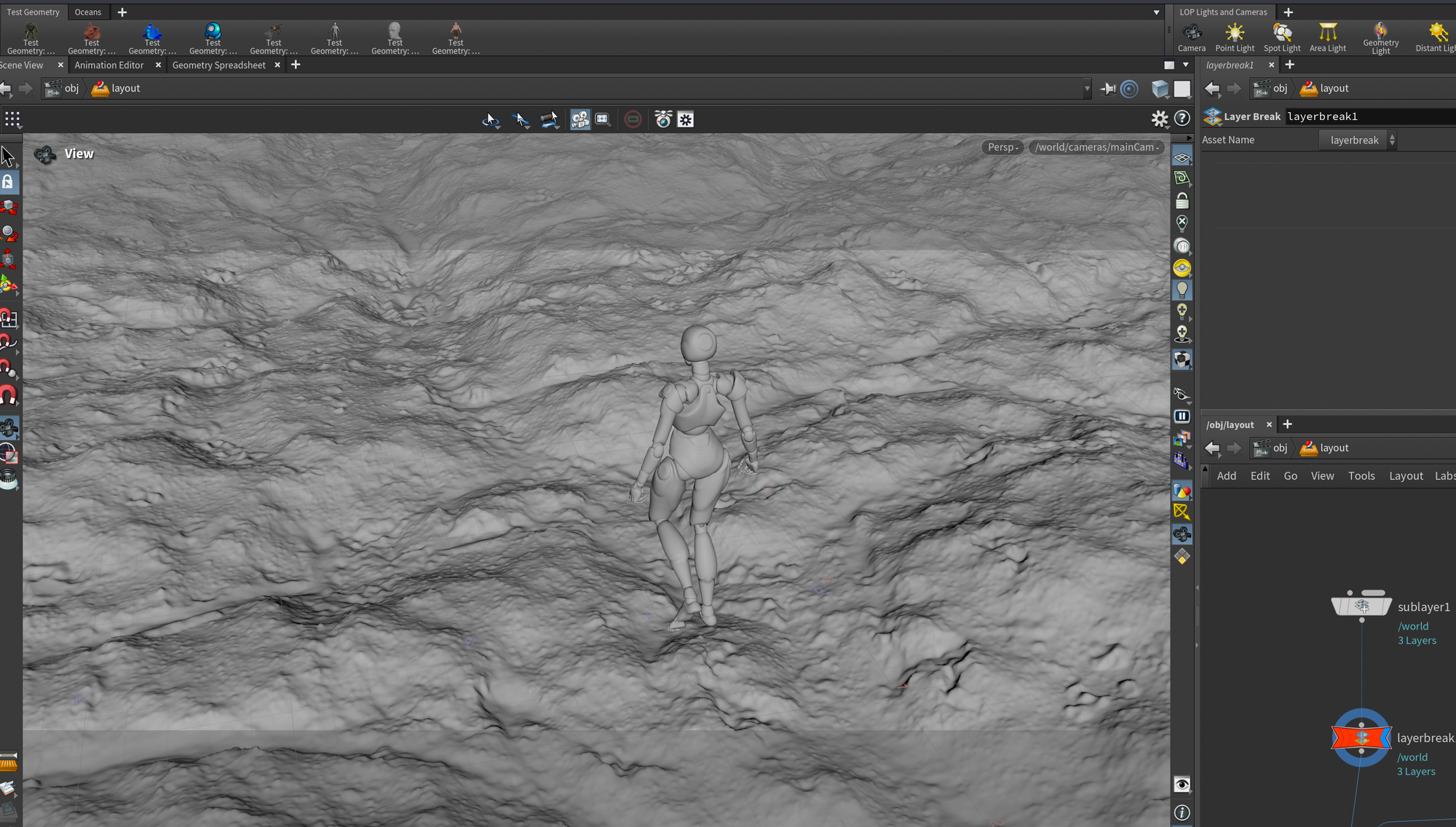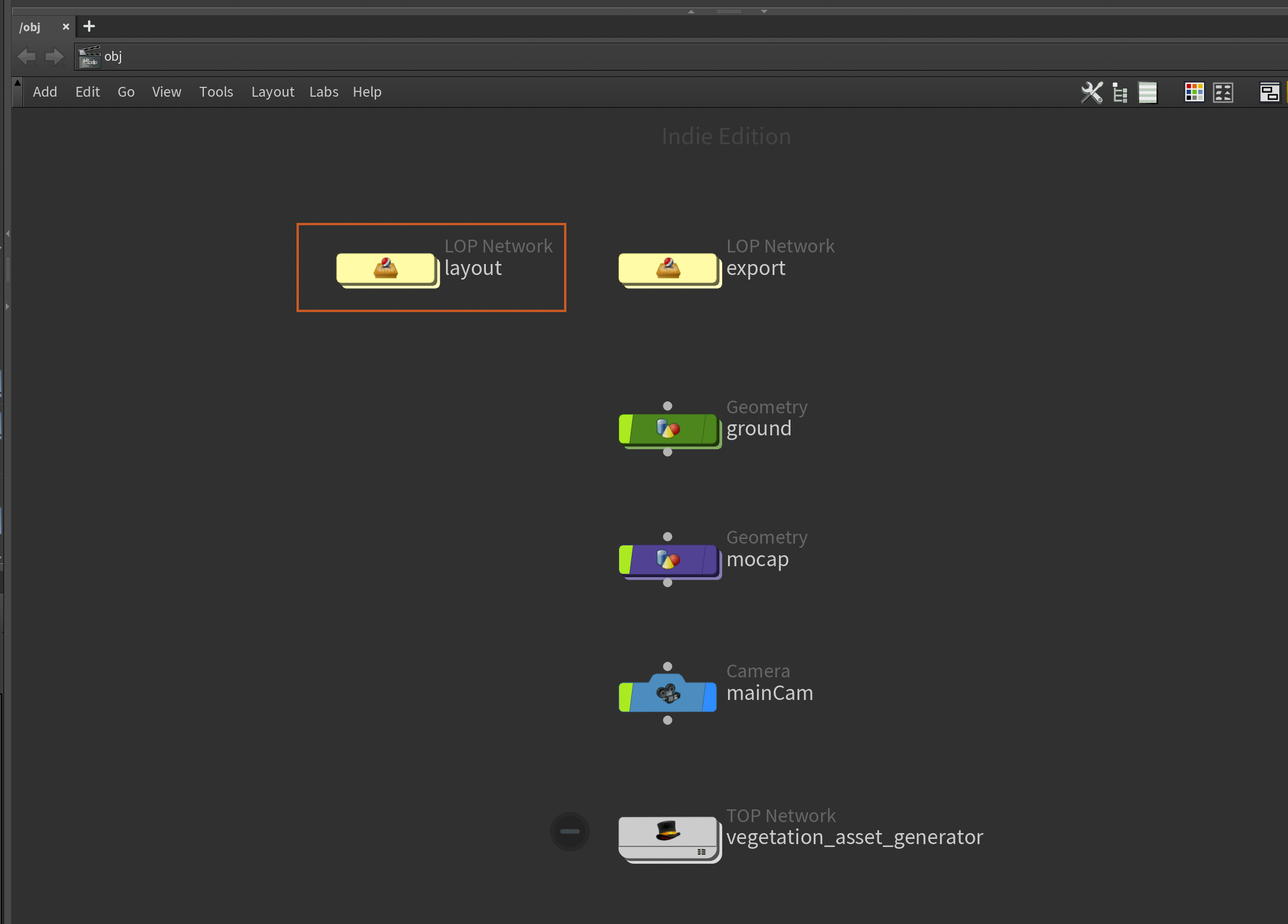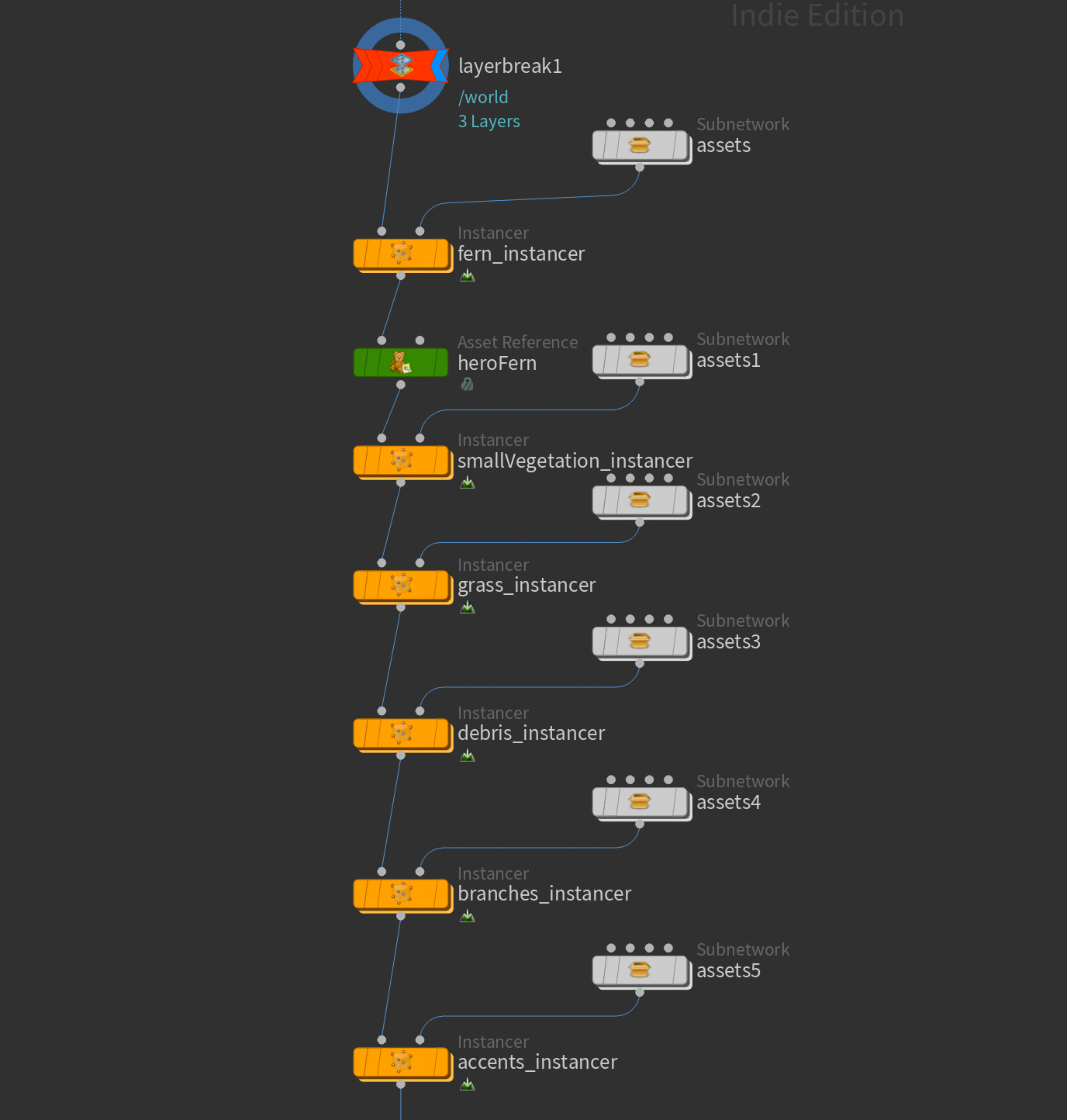 Now let's jump into the vegetation layout for our final scene. Based on the scene above, I created an additional LOP network called layout in /obj. In real productions, you'd likely have separate hip files instead, but in this case, I tried to work within a single scene, creating separate LOP networks instead.