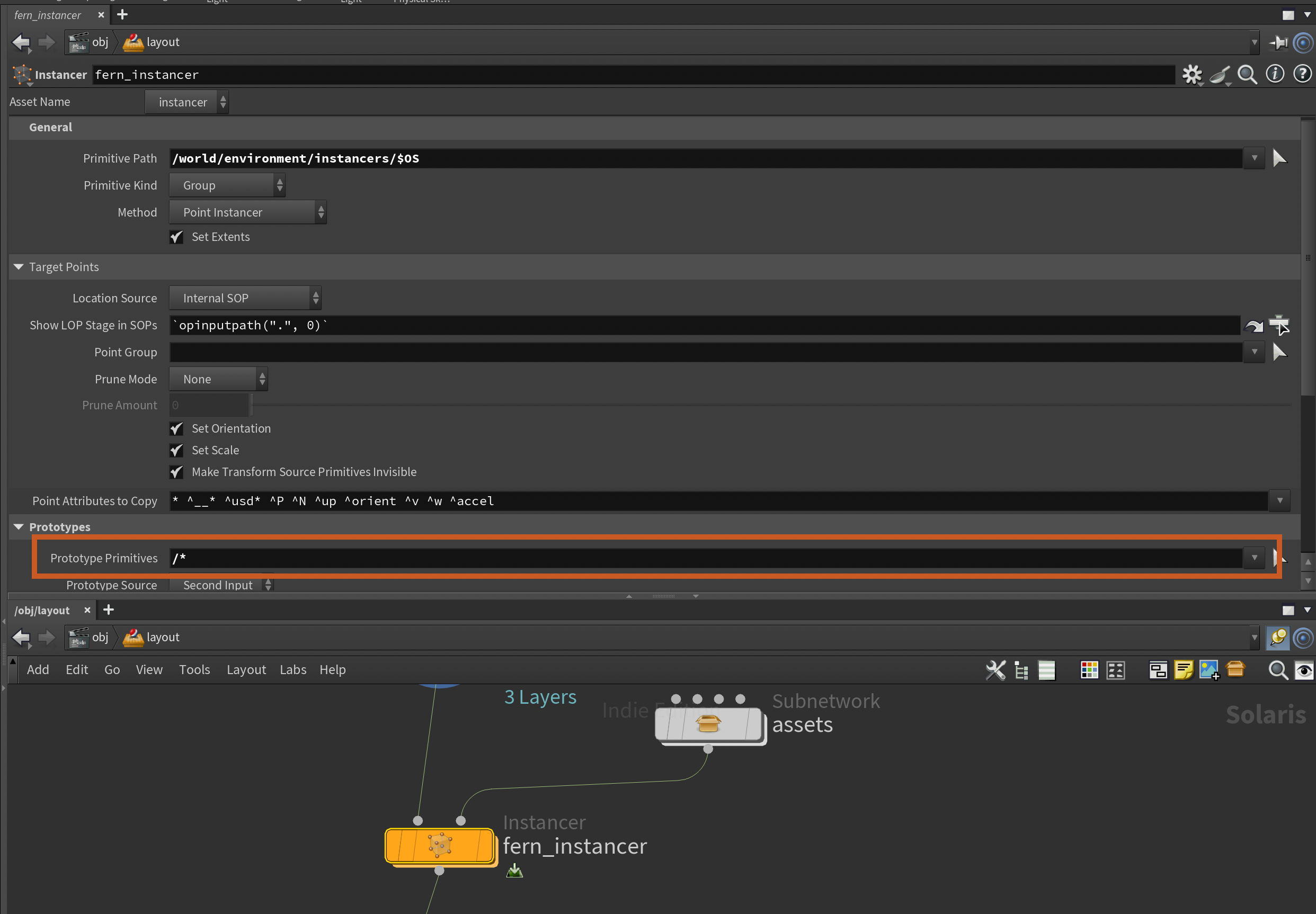 From there, you can use the output of the merge (in my case, I kept the above inside a subnetwork to reduce clutter) and plug it into the second input of an Instancer node. The only parameters you need to modify are the path of the Point Instancer (I always use /world/environment/instancers/$OS) and set the Prototype Primitives to /* to include each primitive in the second input.